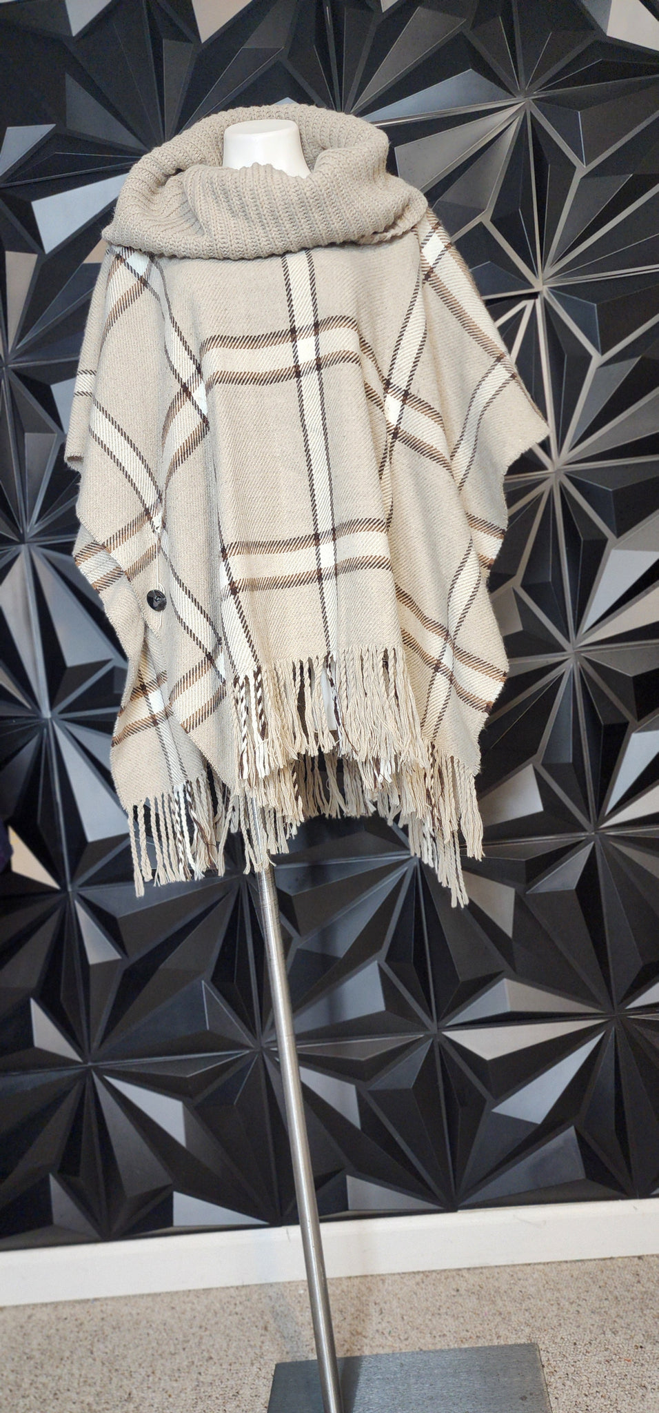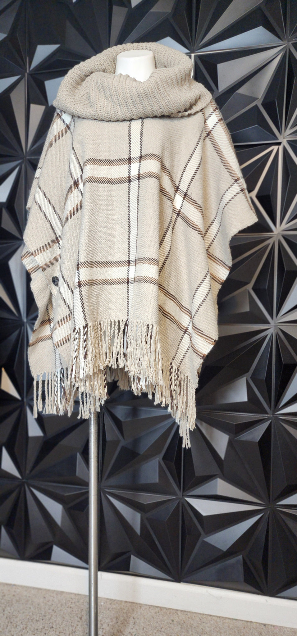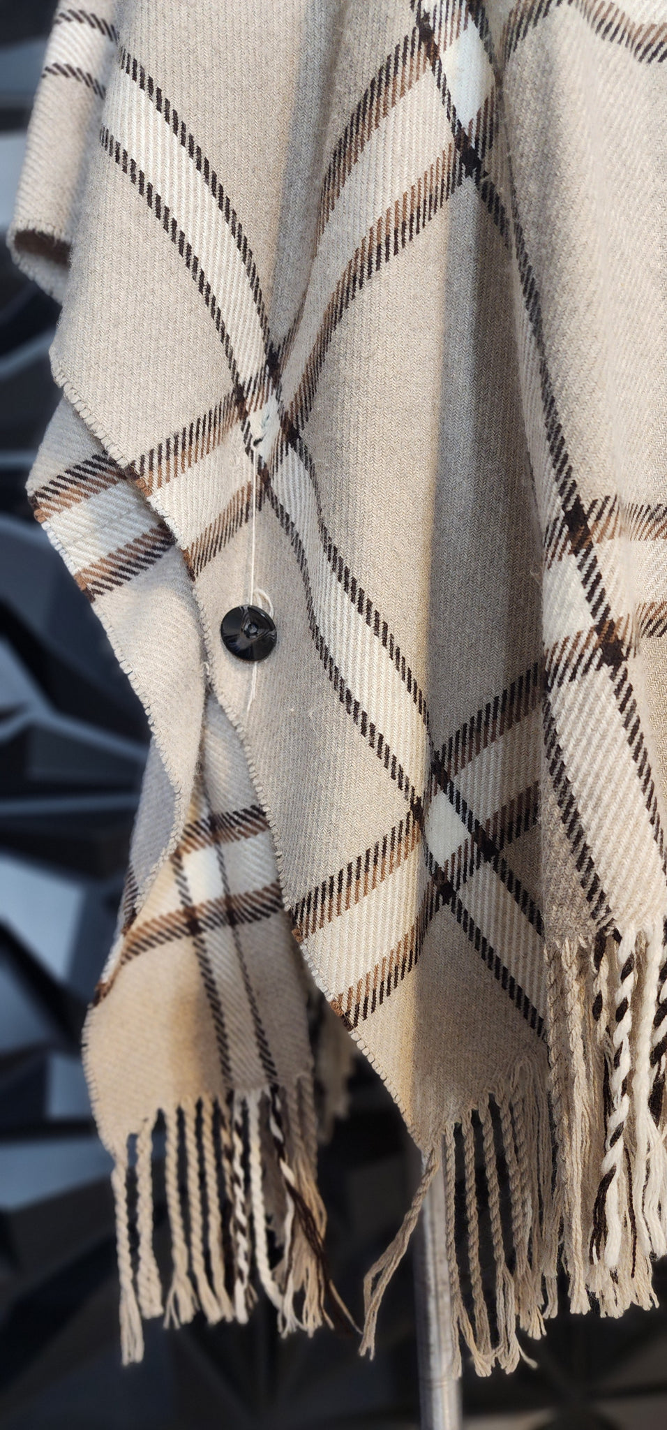 Johnston and Murphy plaid print fringe poncho. This poncho buttons on the sides, but can be pulled over the head. One size, fitting up to a size 2x