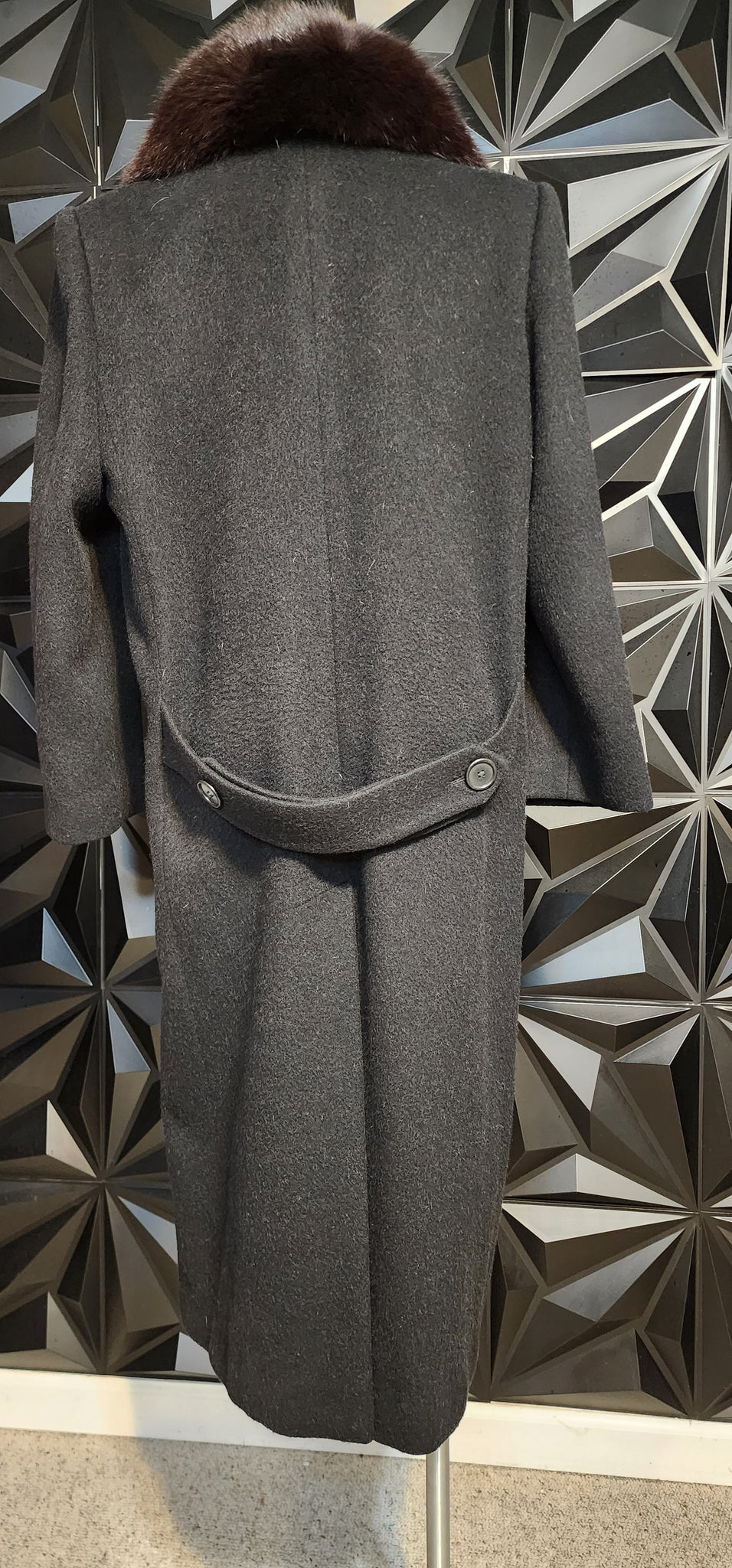 Bill Blass fur trench coat. Button closure. Fur at the collar. Split in the back. Front pockets. Size 10