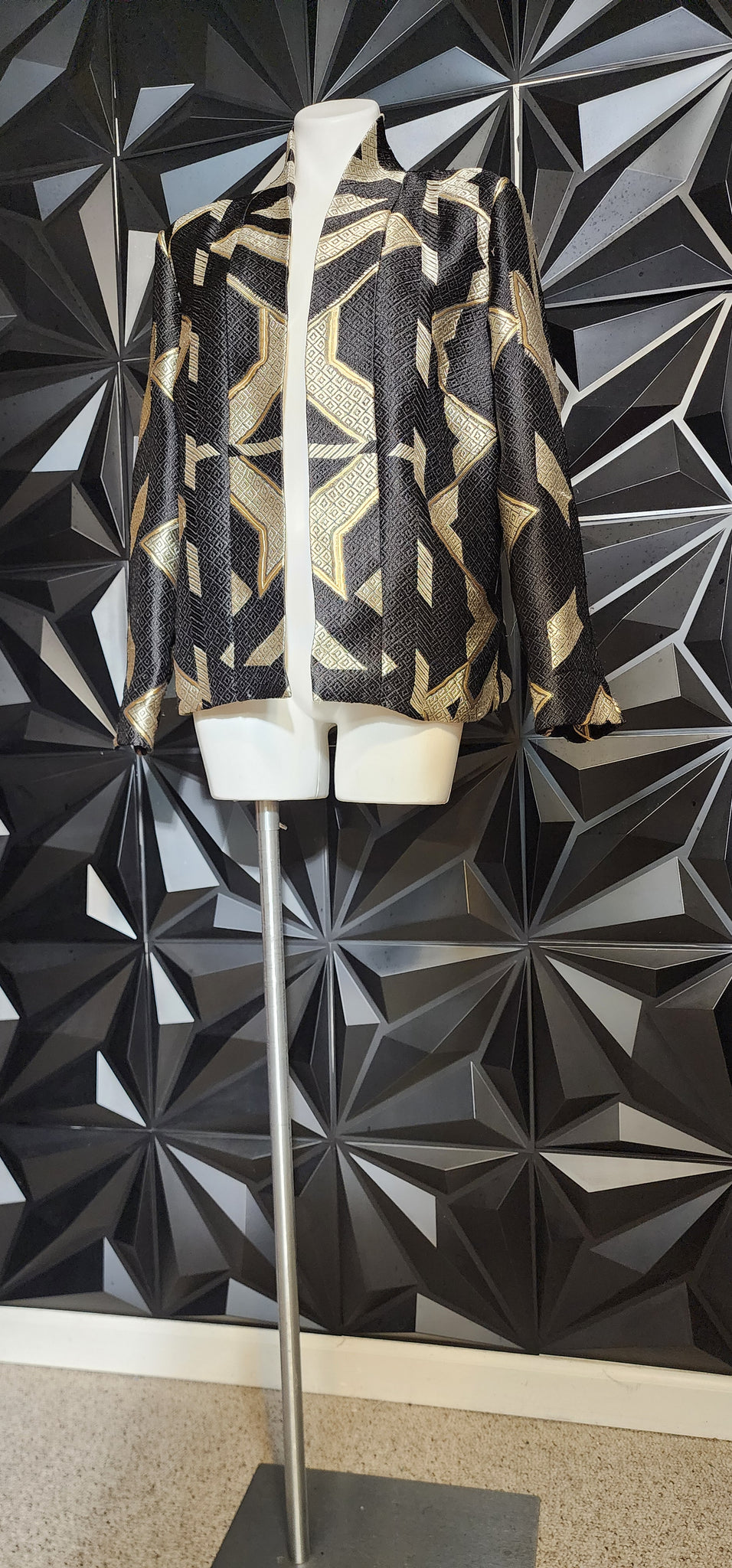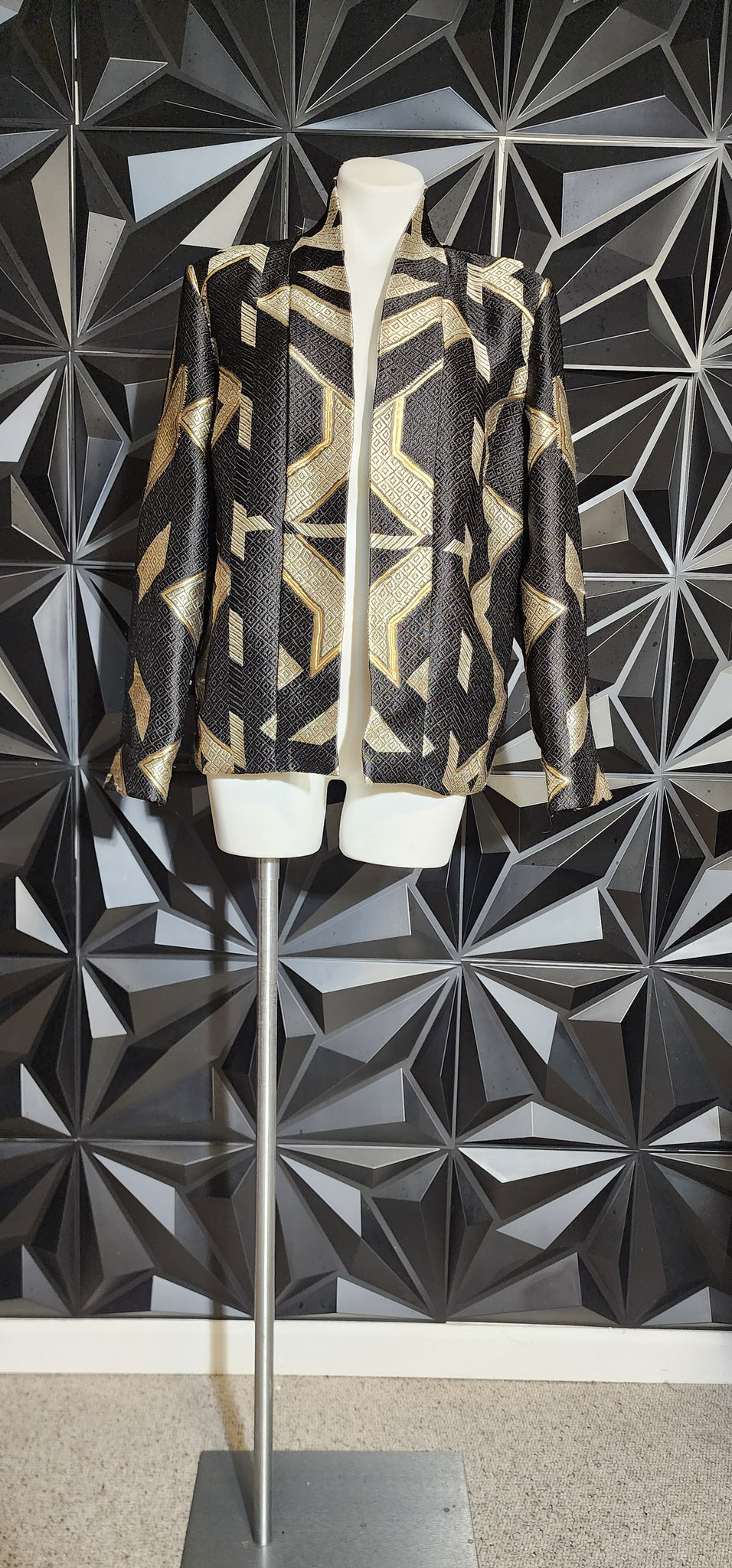Chicos black and gold open front blazer. This blazer is tagged a size Chicos 2=large