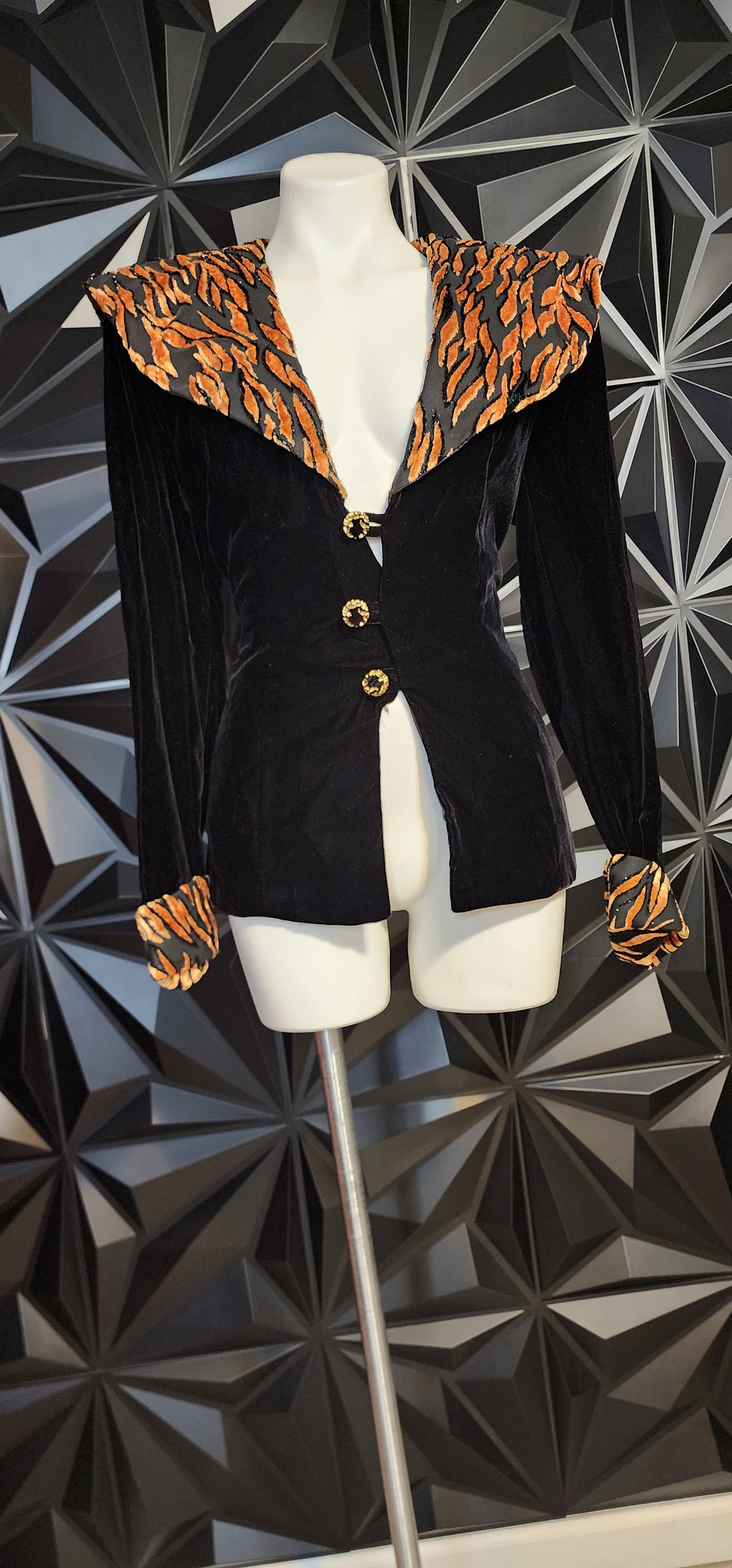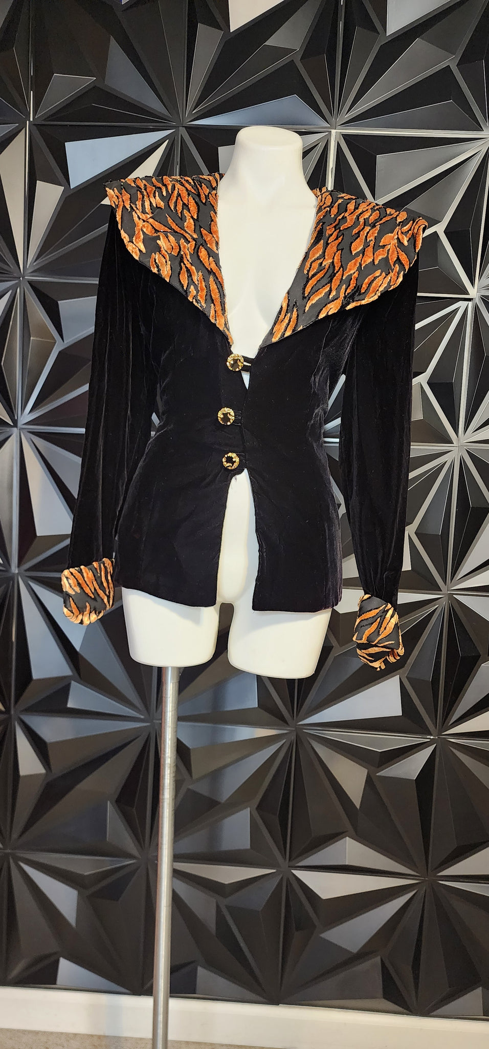 DAVE AND JOHNNY VELOUR VINTAGE BLAZER. BUTTON DOWN THE FRONT. THIS BLAZER IS TAGGED A SIZE 13-14, BEST FITTING A SIZE 10