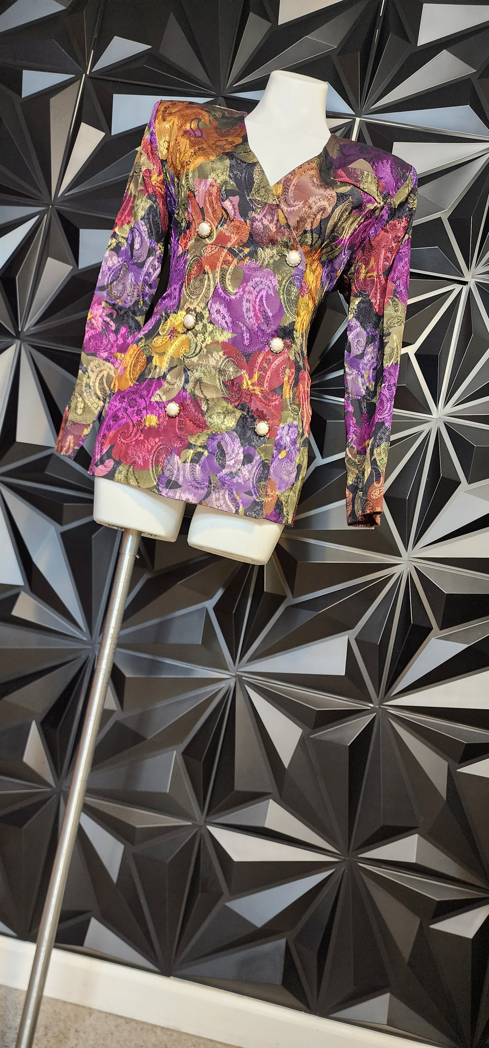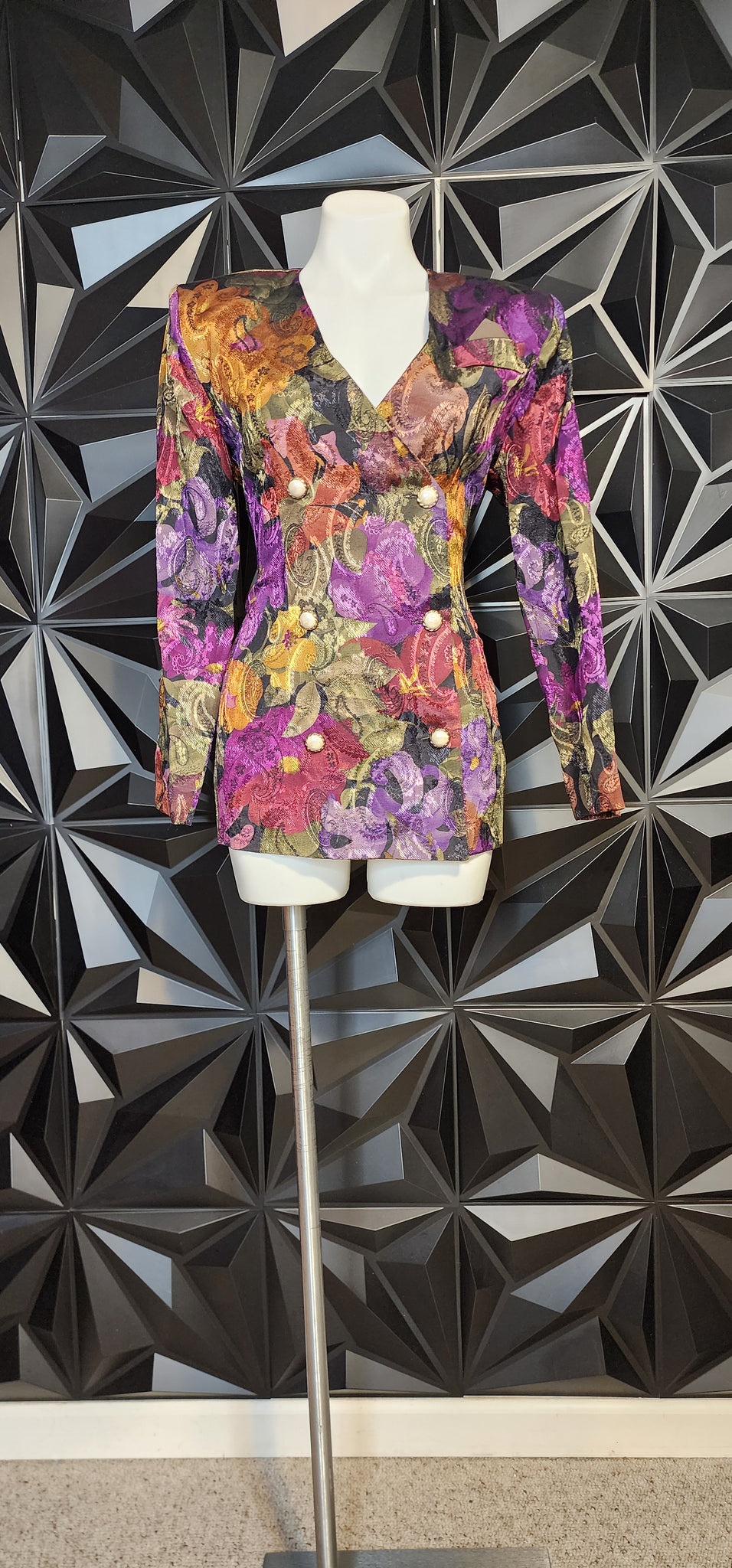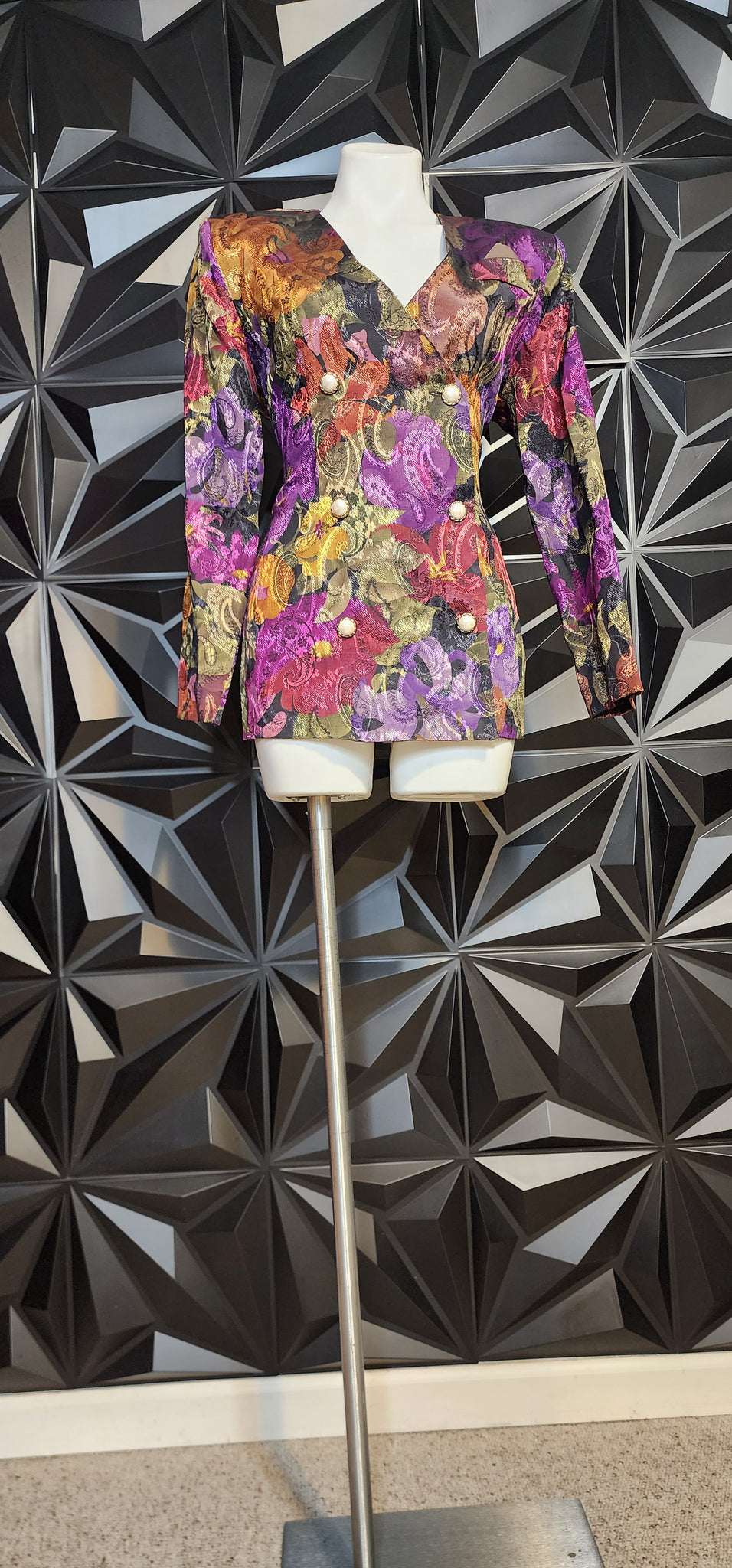 DIAMONDS RUN VINTAGE BLAZER. DOUBLE BREAST BUTTON FRONT. THIS BLAZER IS TAGGED A SIZE 9-10, BEST FITTING A SIZE 8. THIS BLAZER DOES HAVE SHOULDER PADS