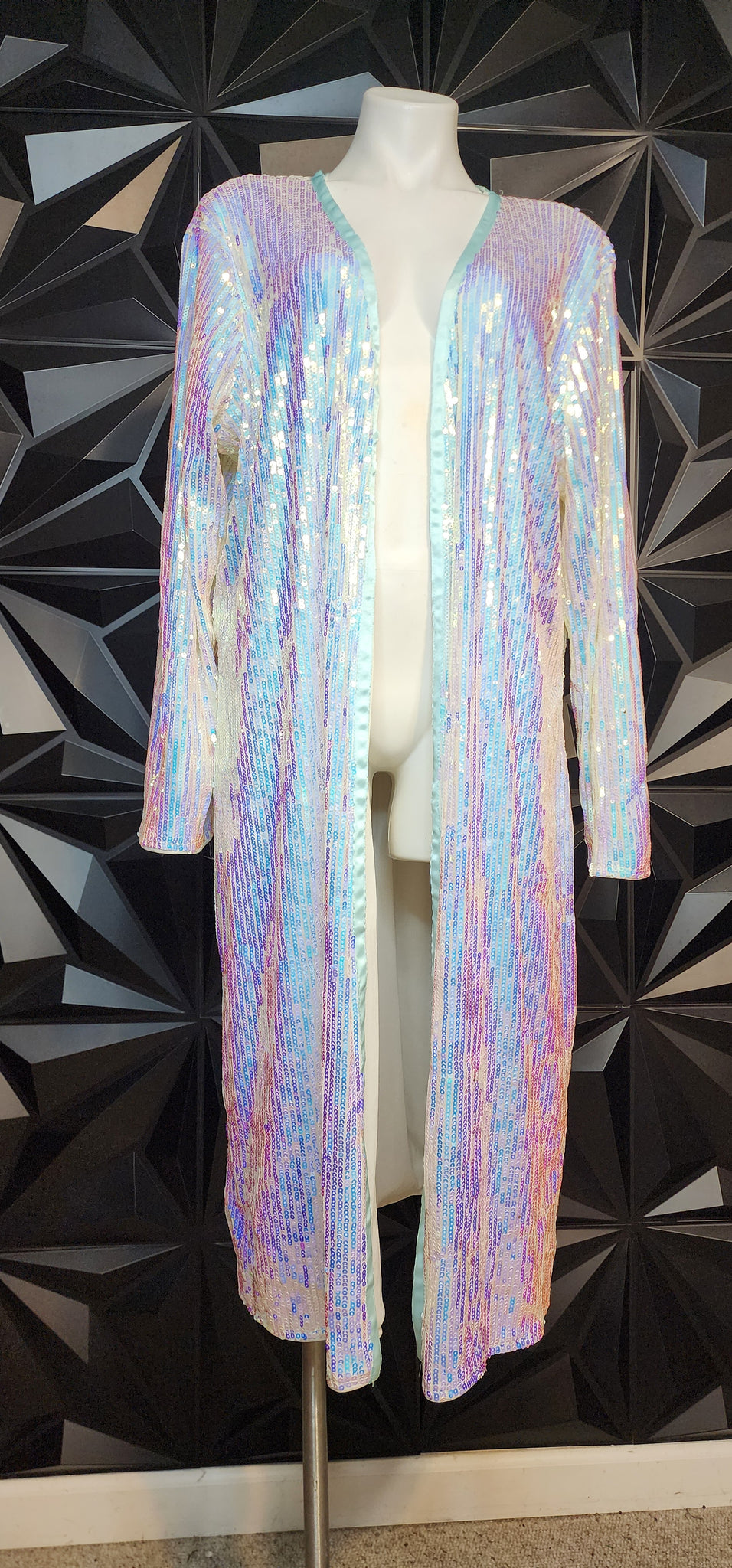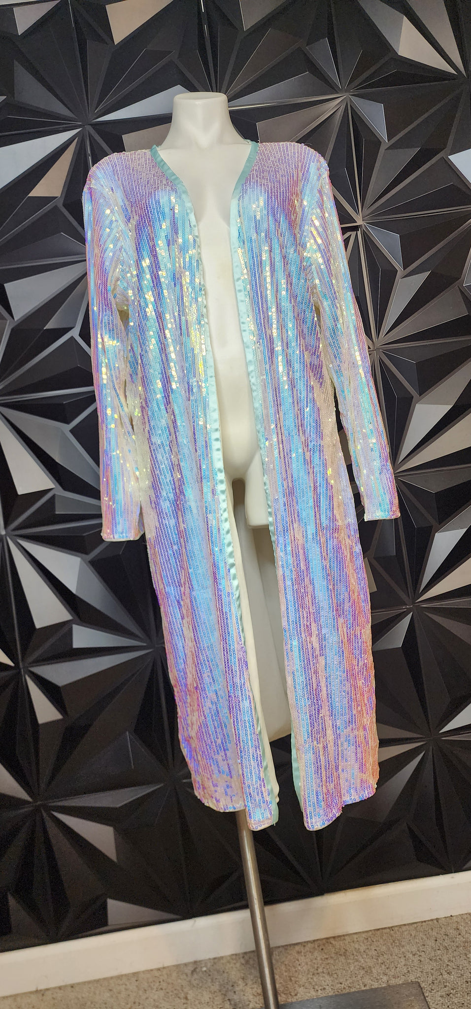 Highlight iridescent fully sequin long duster. Lining inside.  This duster is open front, no closure. One size
