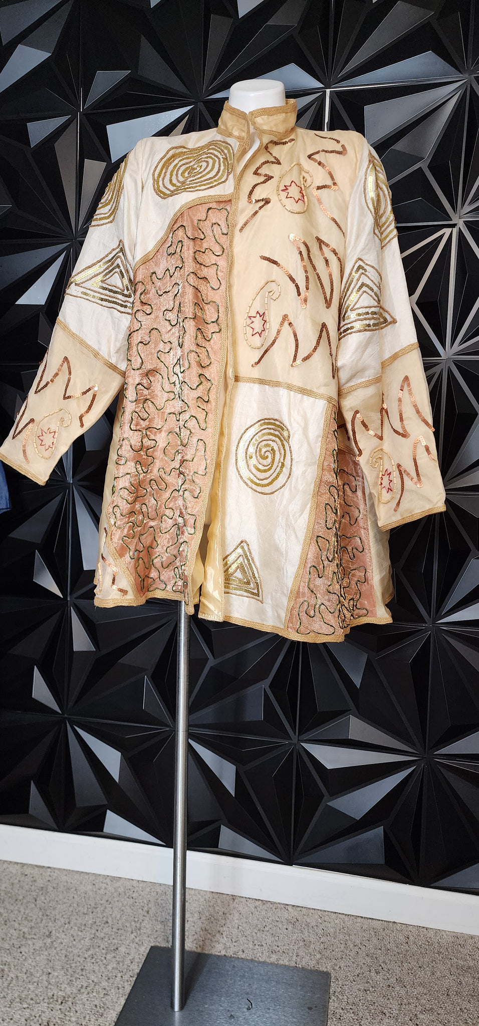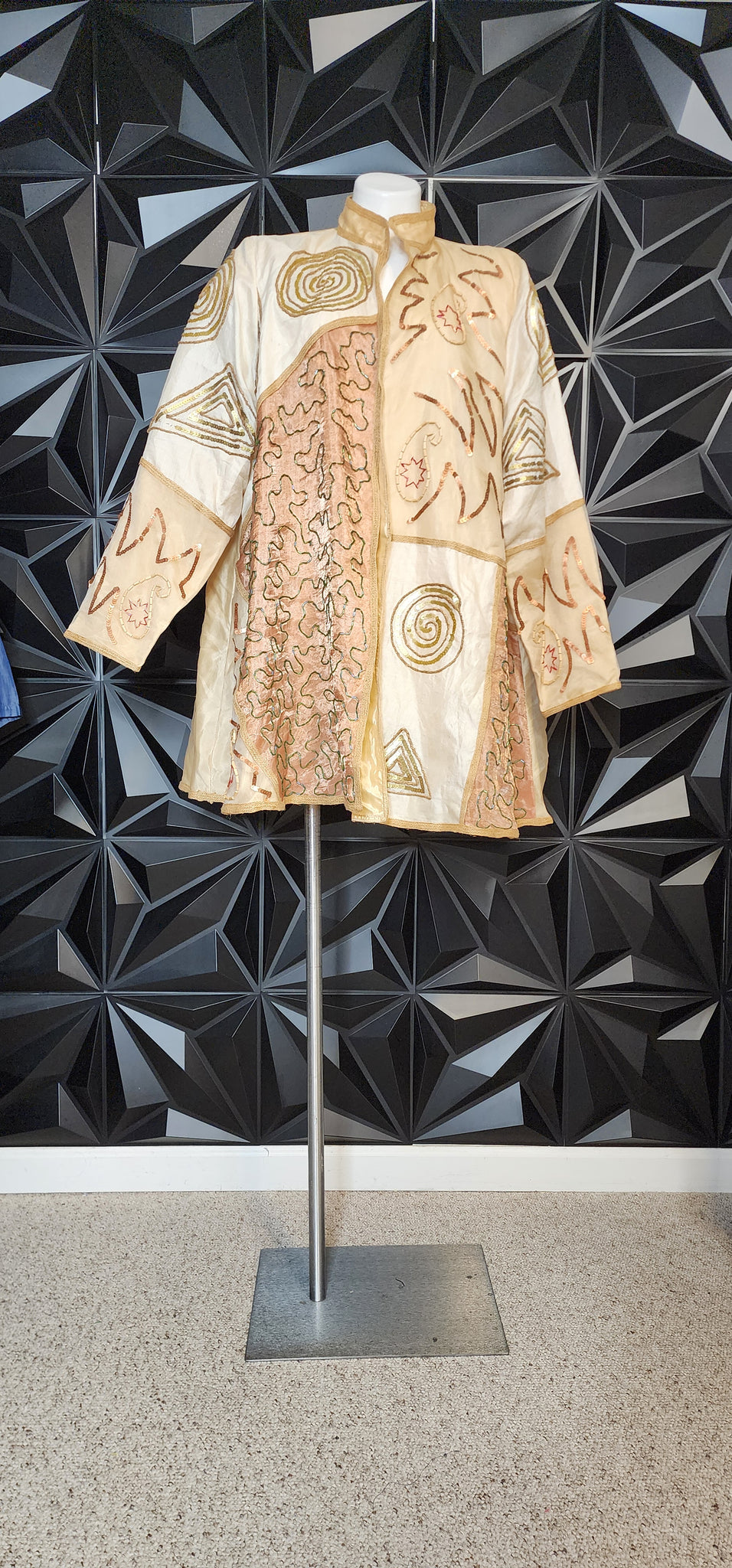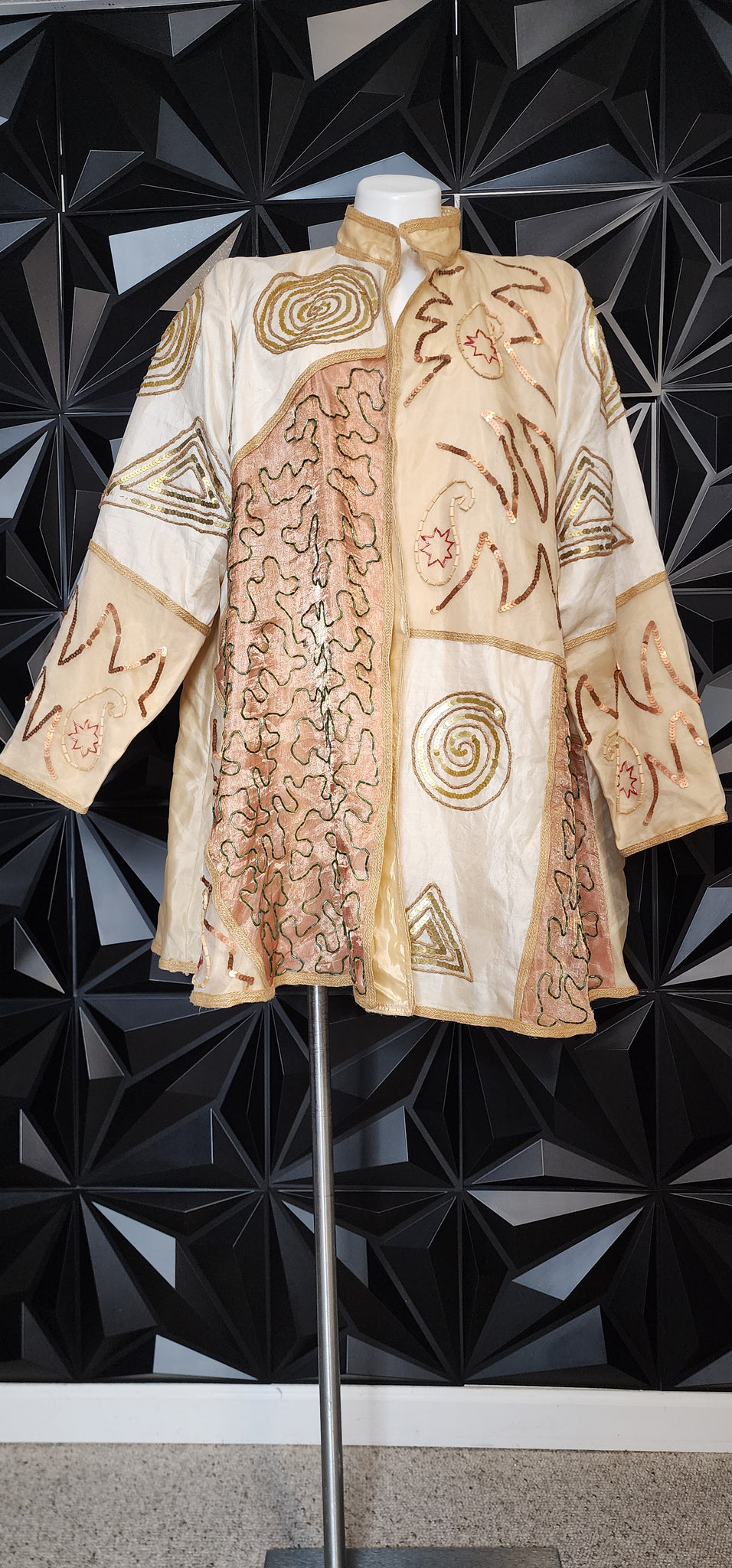 Jewel Queen beaded and sequin duster. 100% pure silk with polyester lining. Made in India. Removable shoulder pads. Hook latch closures at the neck (1 hook being loose). one size. Fitting a size xlrg-3x