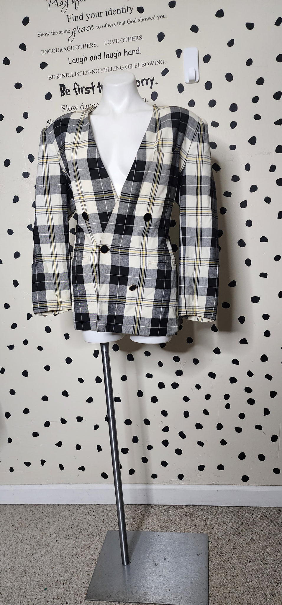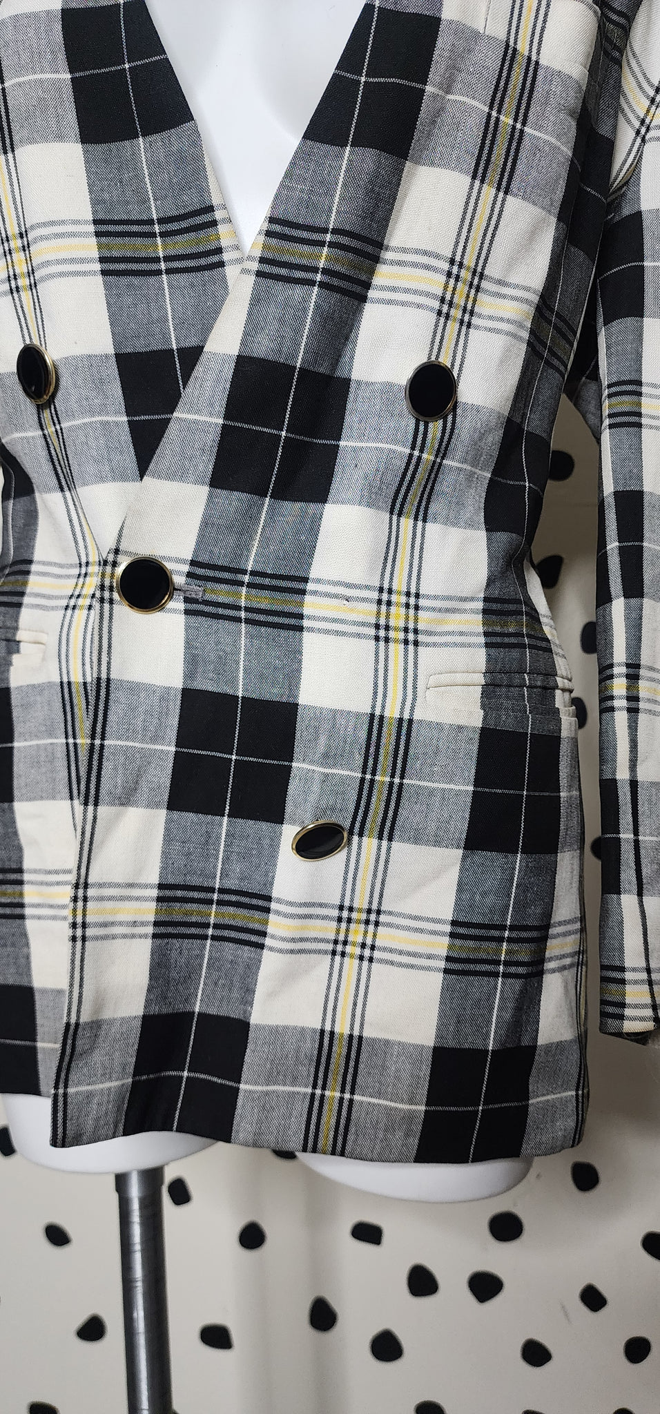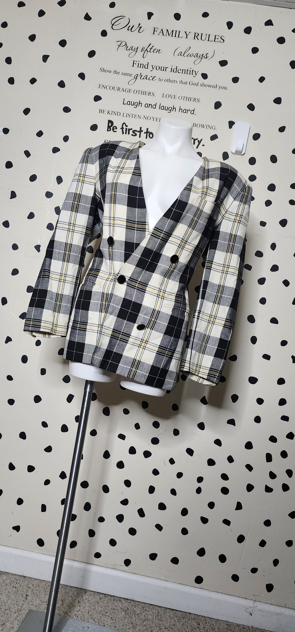 KASPER BOX PRINT BLAZER. TAGGED A SIZE 14, BEST FITTING A SIZE 12. SHOULDER PADS INSIDE.