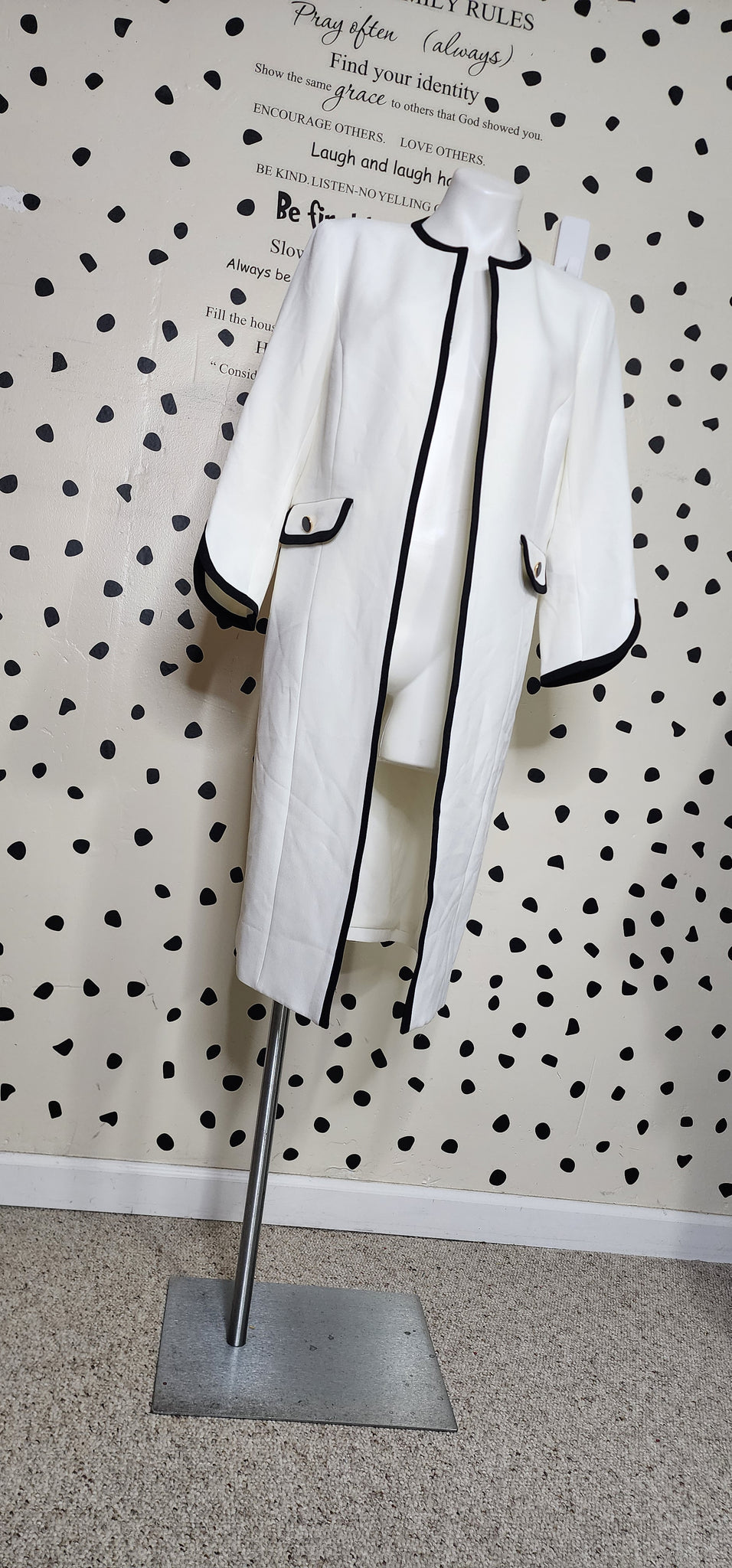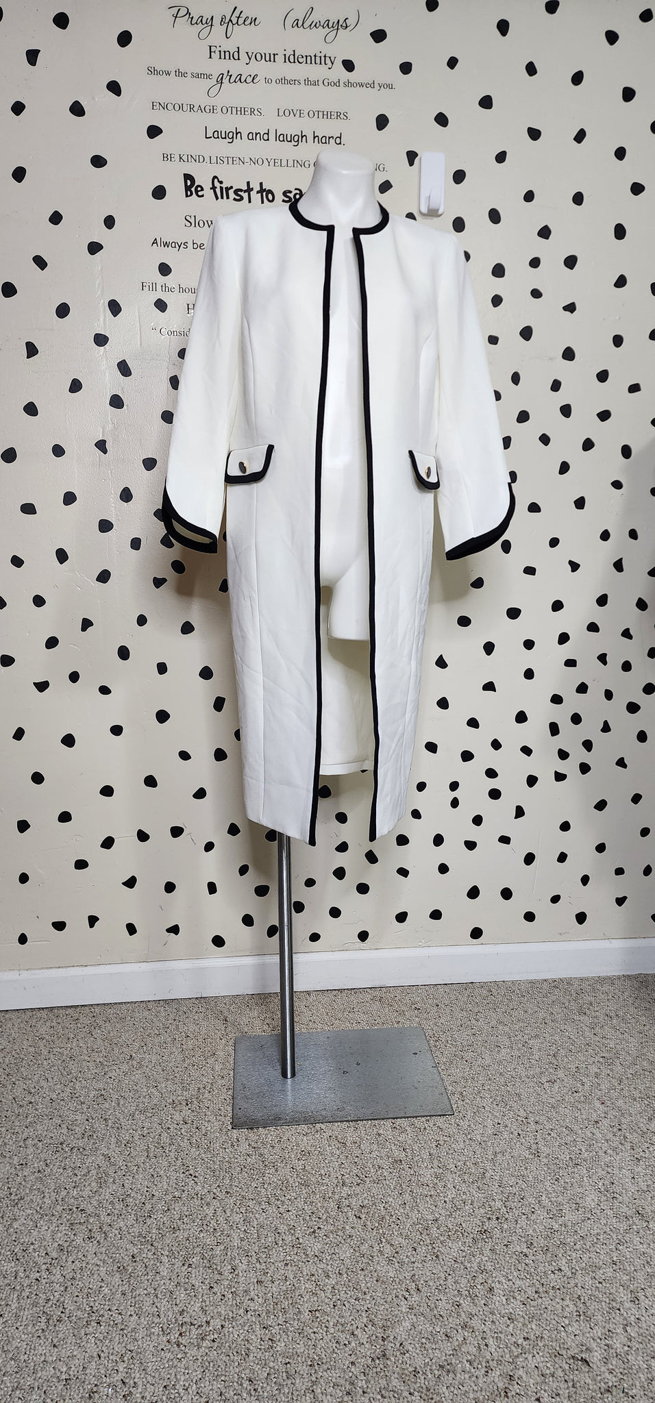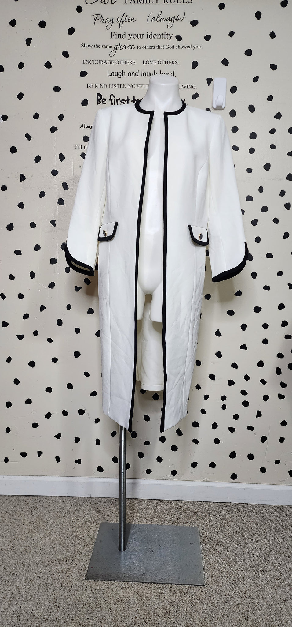 KASPER WHITE LONG OPEN FRONT BLAZER. BLAZER TRIMMED IN BLACK. UNTAGGED. THIS BLAZER BEST FITTING SZ 8-10.