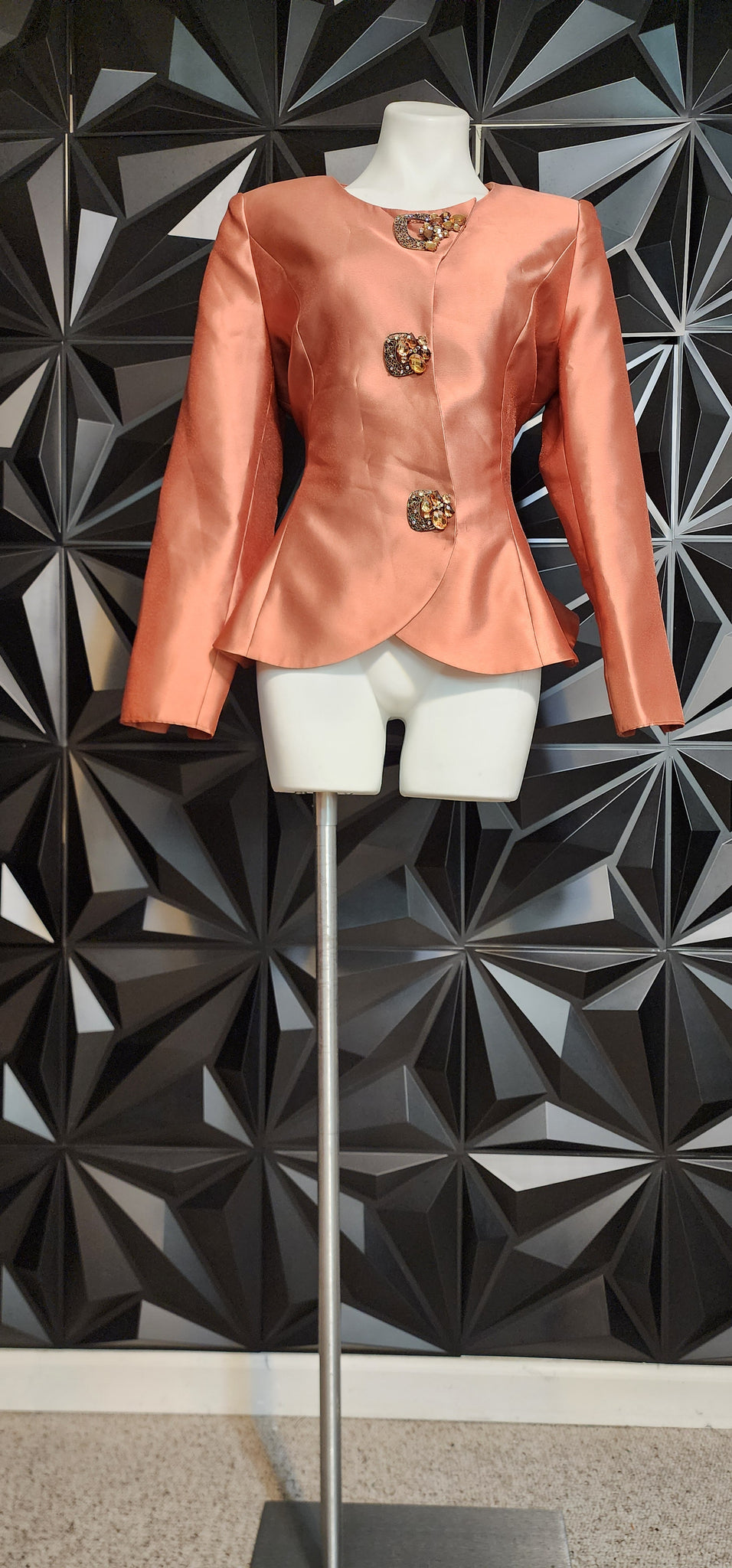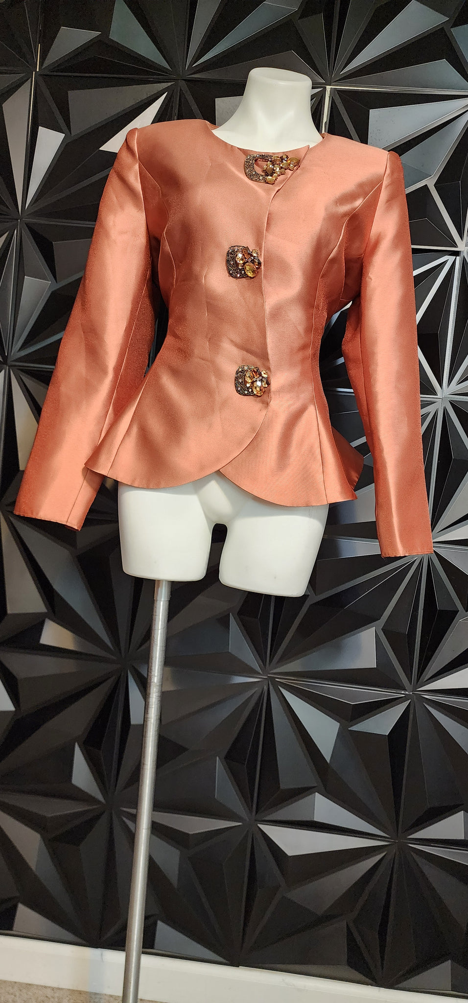 Moshita Couture fit and flare blazer. Snaps down the front. Luxury oversize embellishments in the front. Tagged a size 8 (fitting up to non busty 10. Has shoulder pads