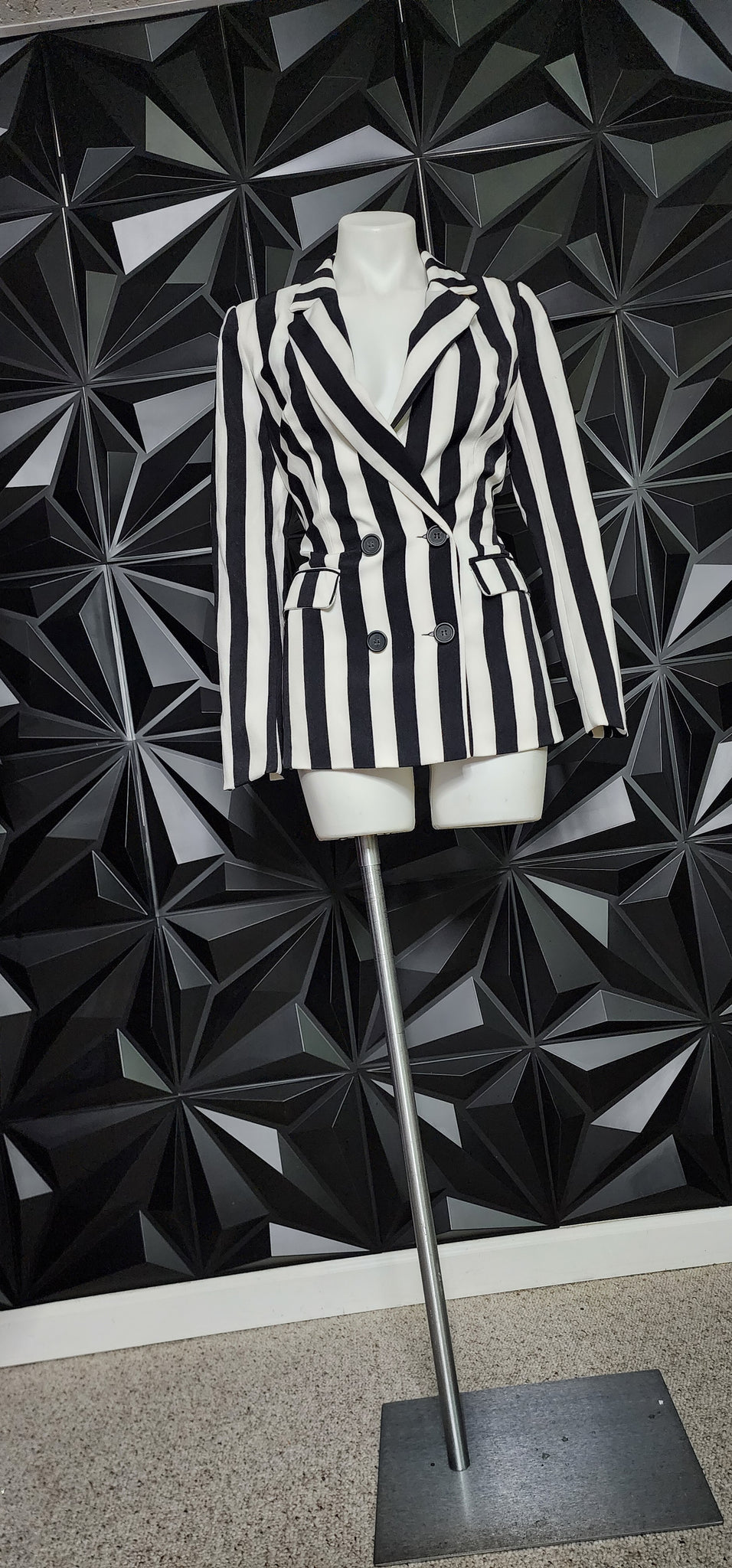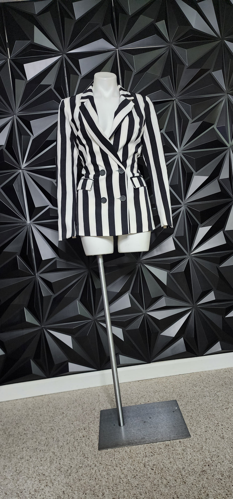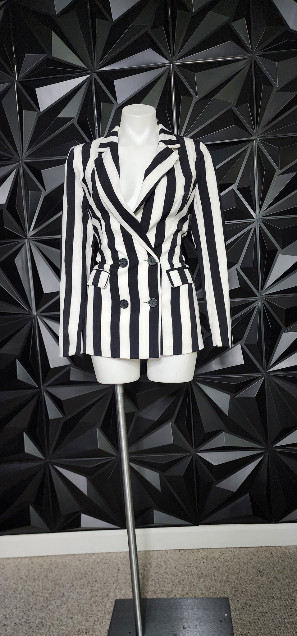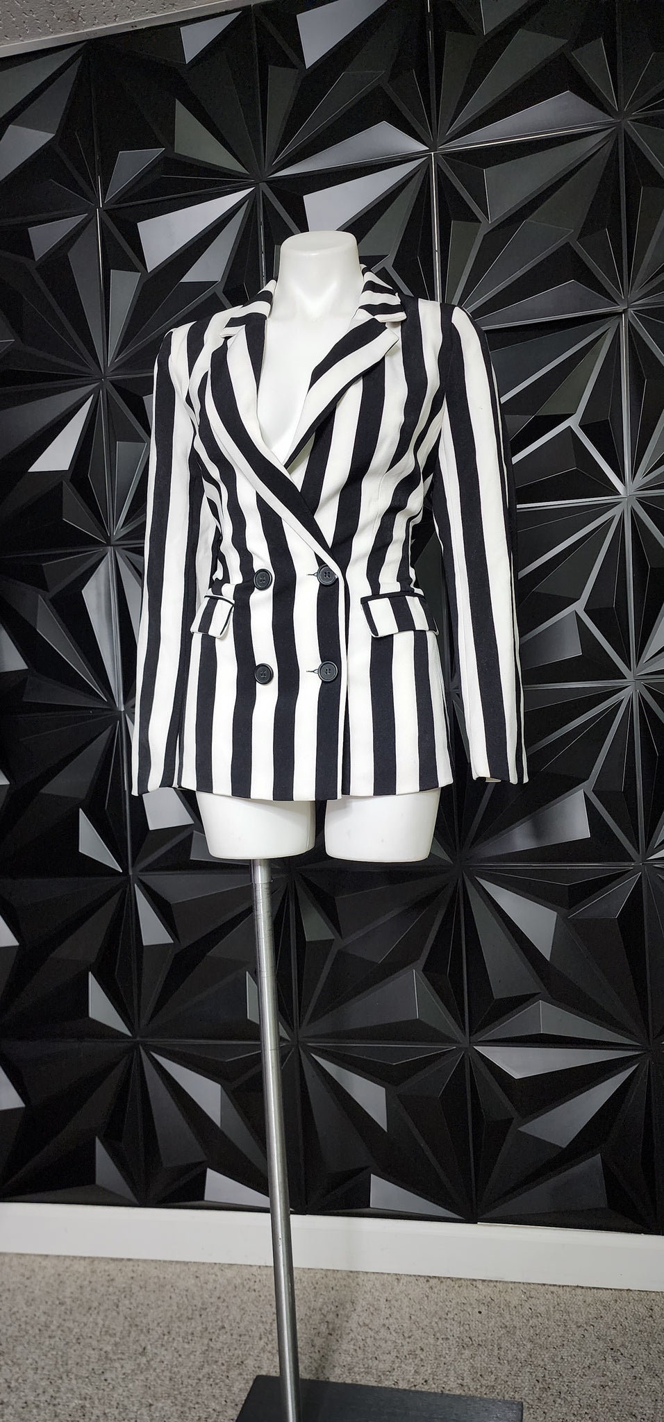 NEW WITH TAGS VERA & LUCY BLACK AND WHITE STRIPE BLAZER. DOUBLE BREAST BUTTON FRONT. FUNCTIONAL POCKETS IN FRONT. THIS BLAZER IS A SIZE SMALL