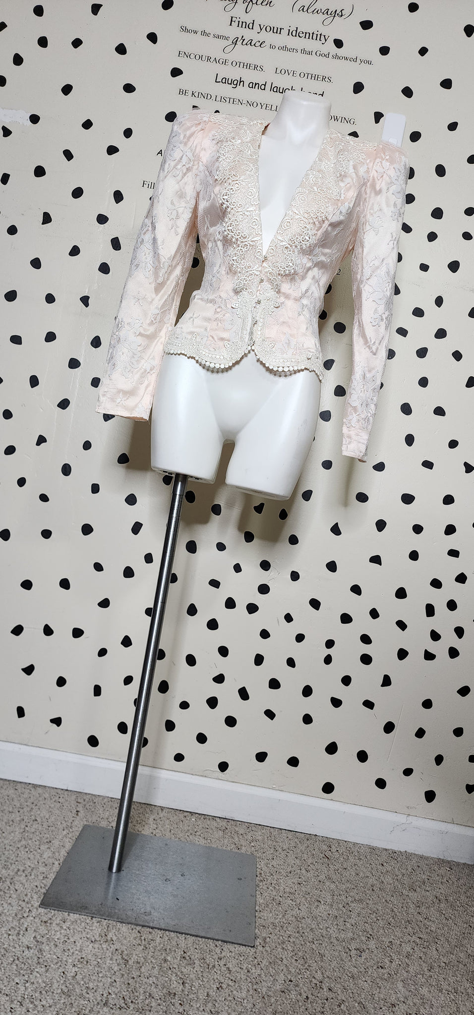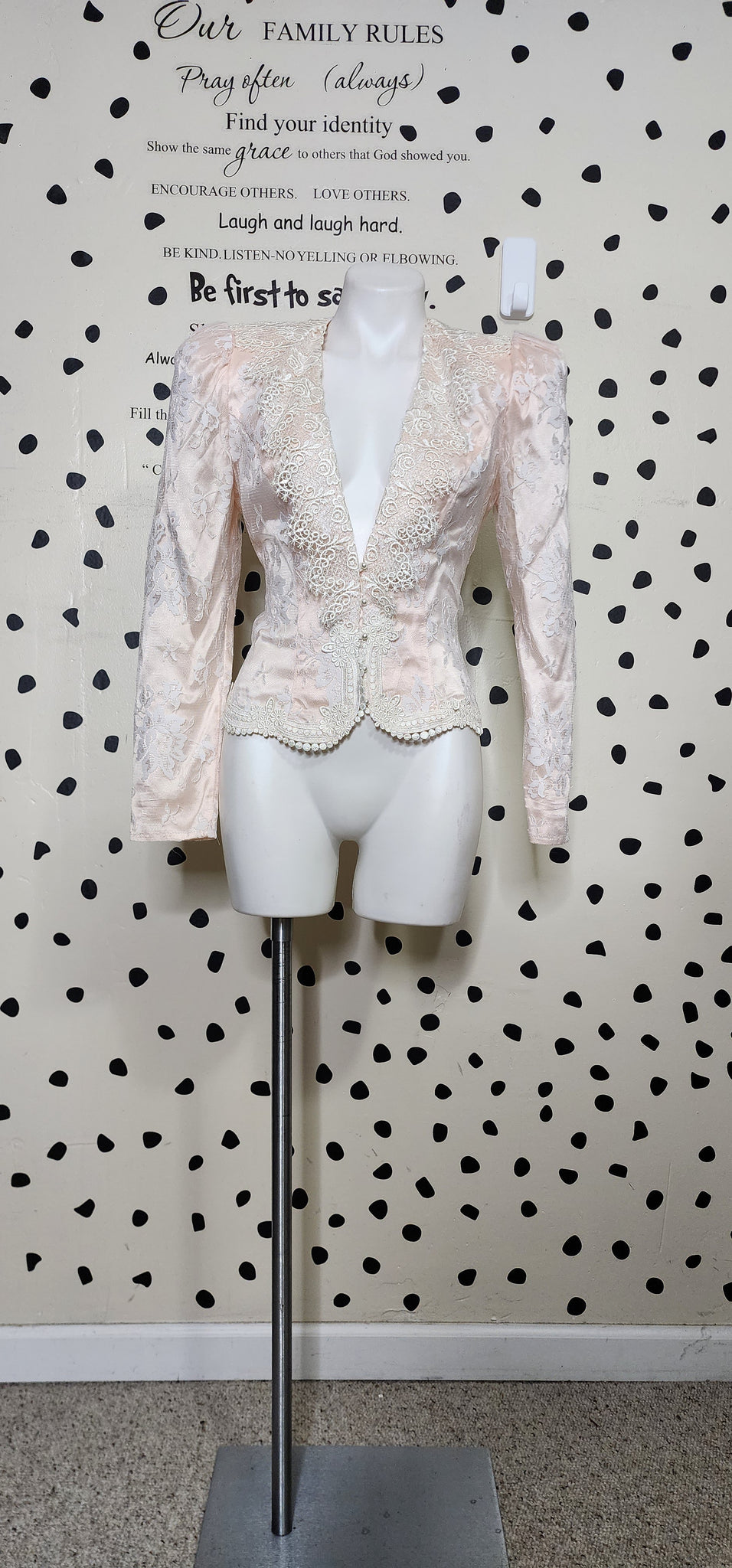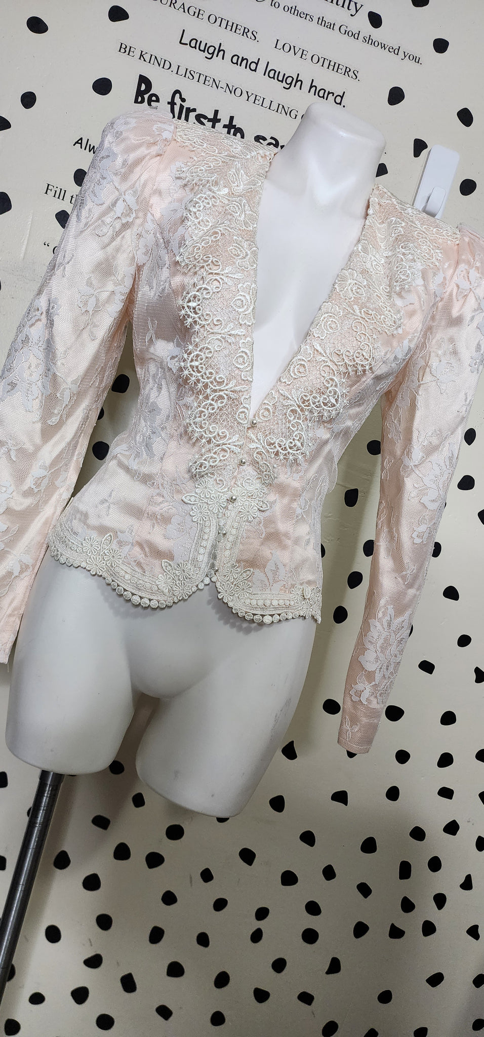 SCOTT MCCLINTOCK LACE BLAZER. CREAM AND PINK IN COLOR. THIS BLAZER HAS HOOK BUTTONS IN THE FRONT. HEAVY SHOULDER PADDING FOR DRAMATIC LOOK. THIS BLAZER IS A SIZE 6. MADE IN THE US