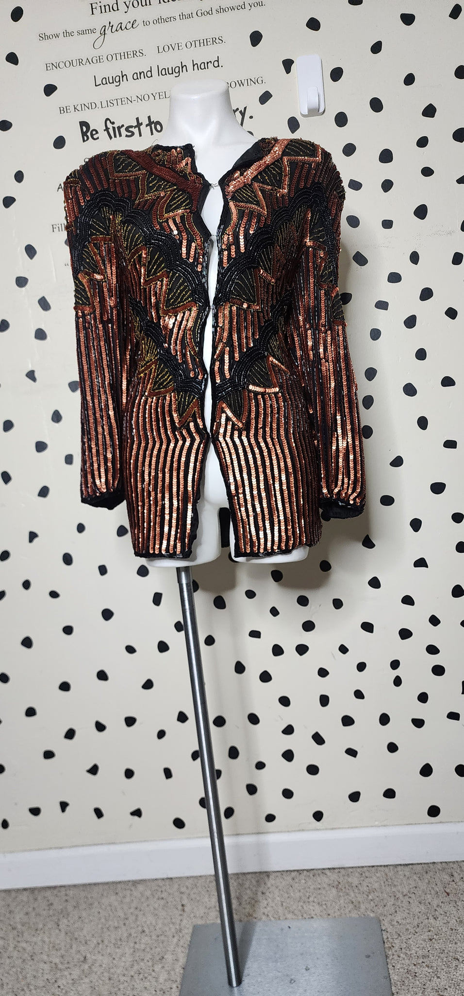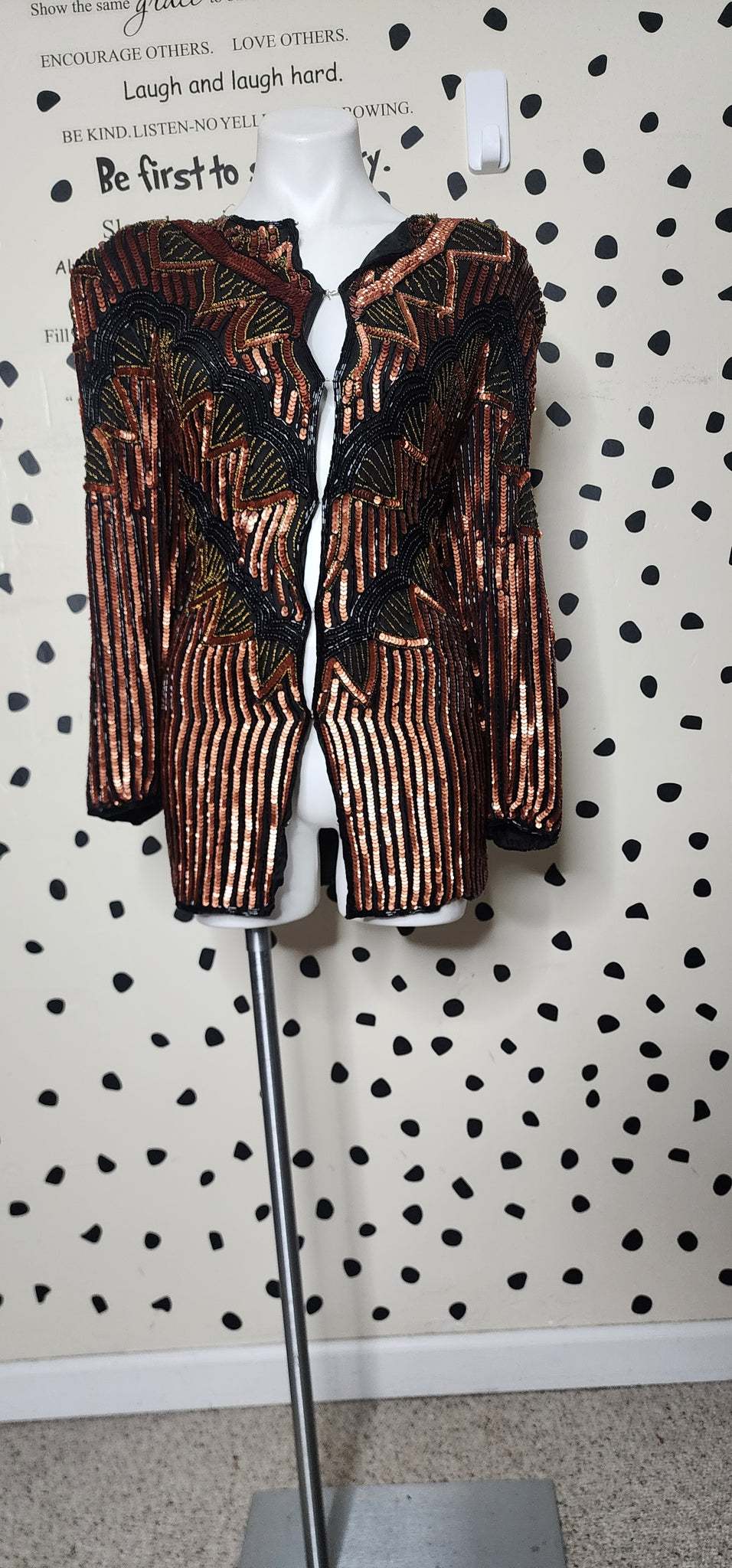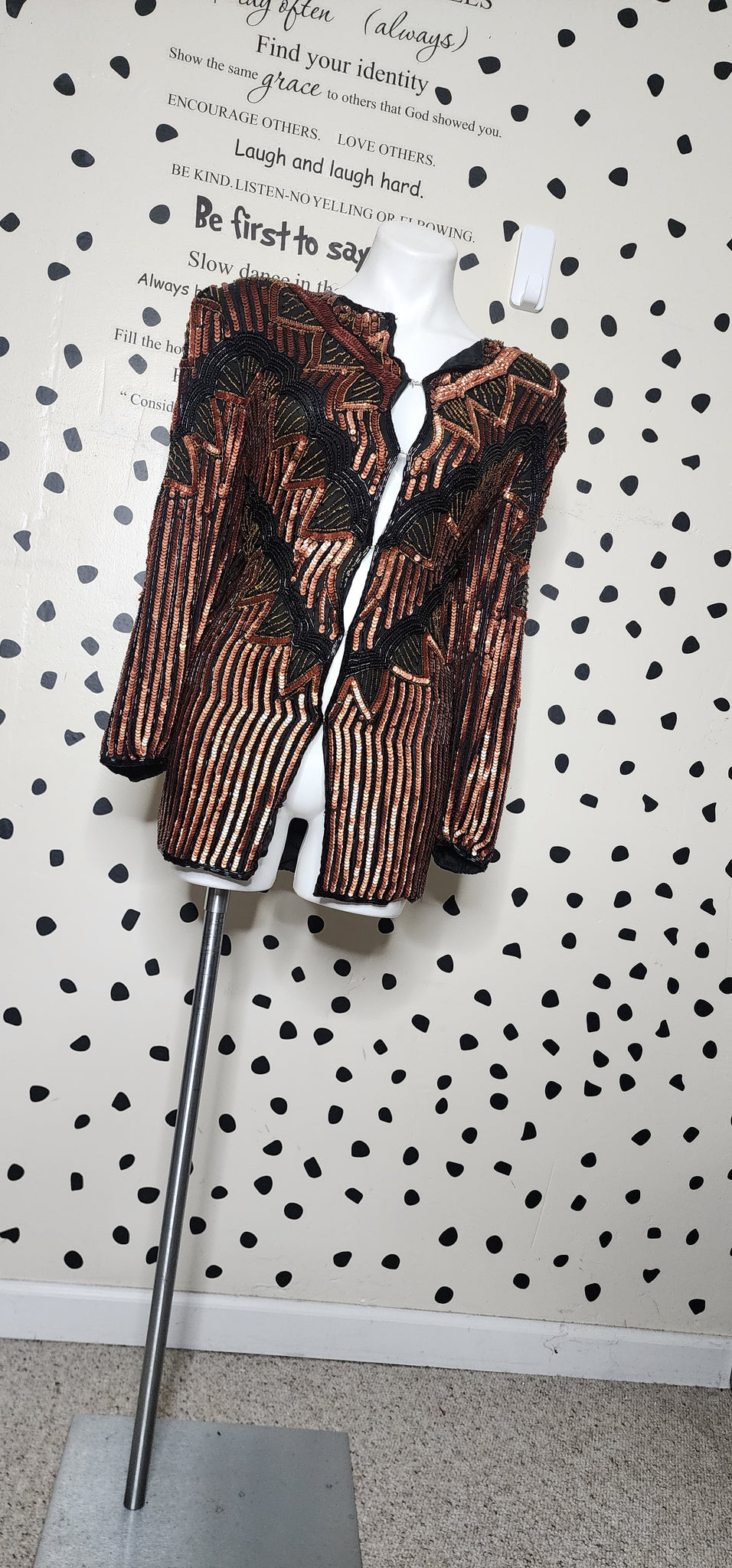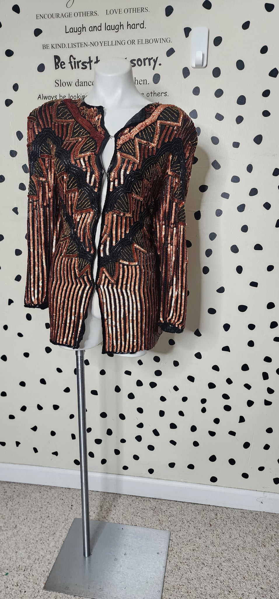 FULLY SEQUIN AND BEADED LONG BLAZER. THIS BLAZER IS A SIZE XL. SHOULDER PADS INSIDE. HOOK CLOSURES