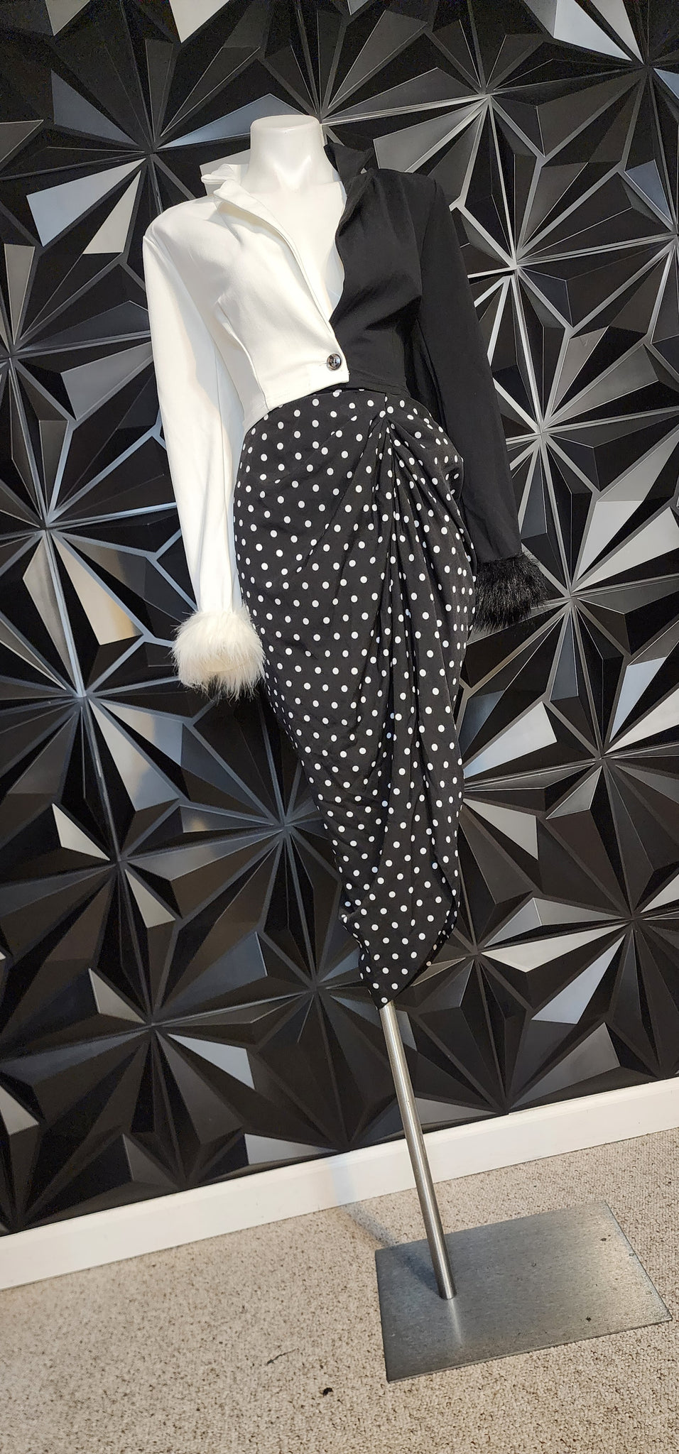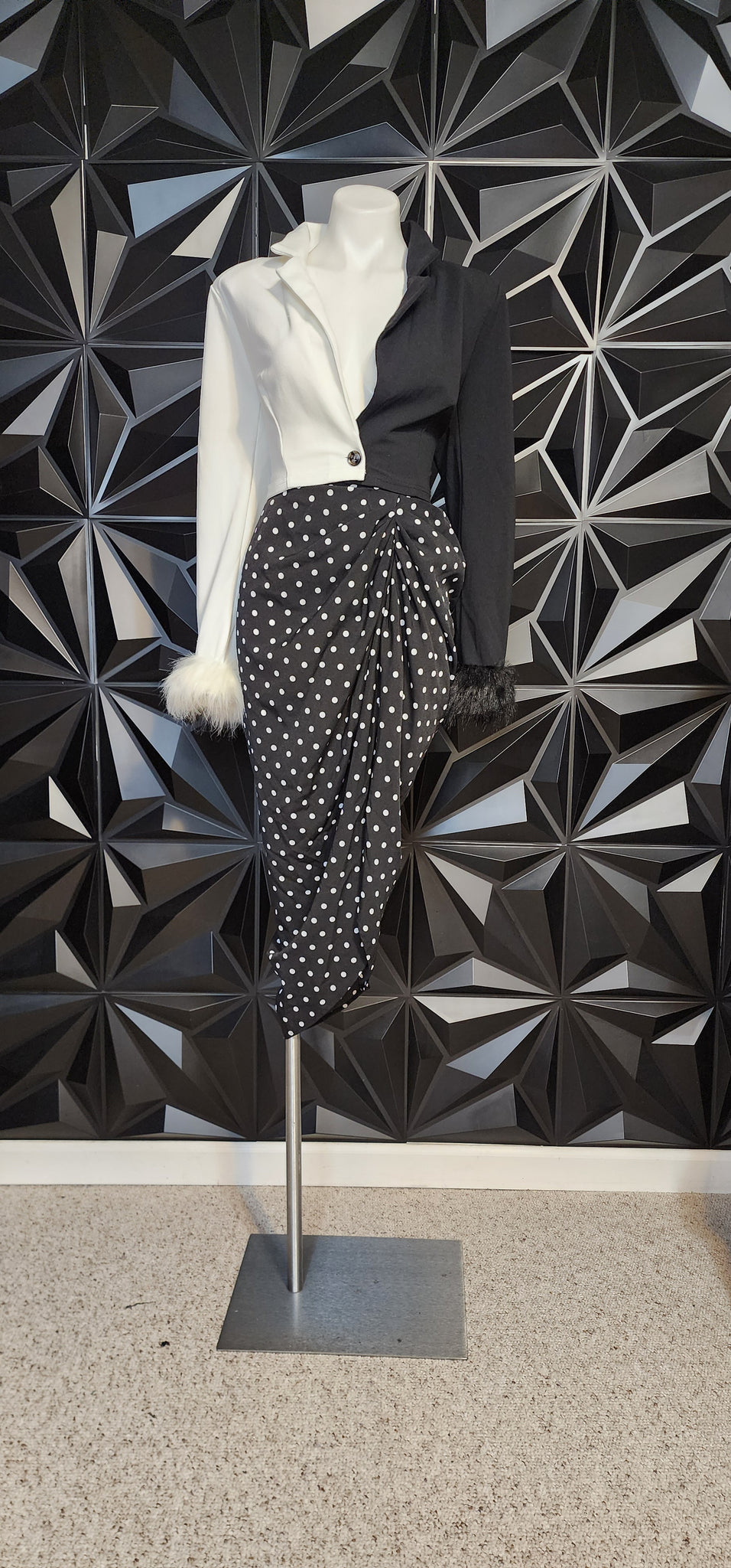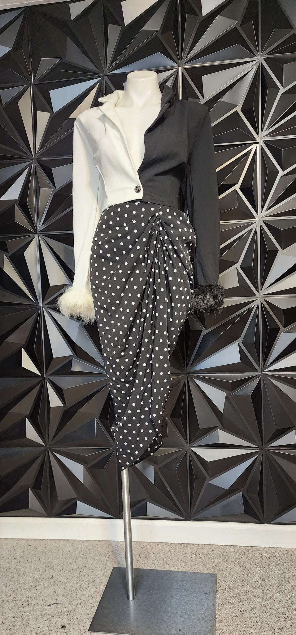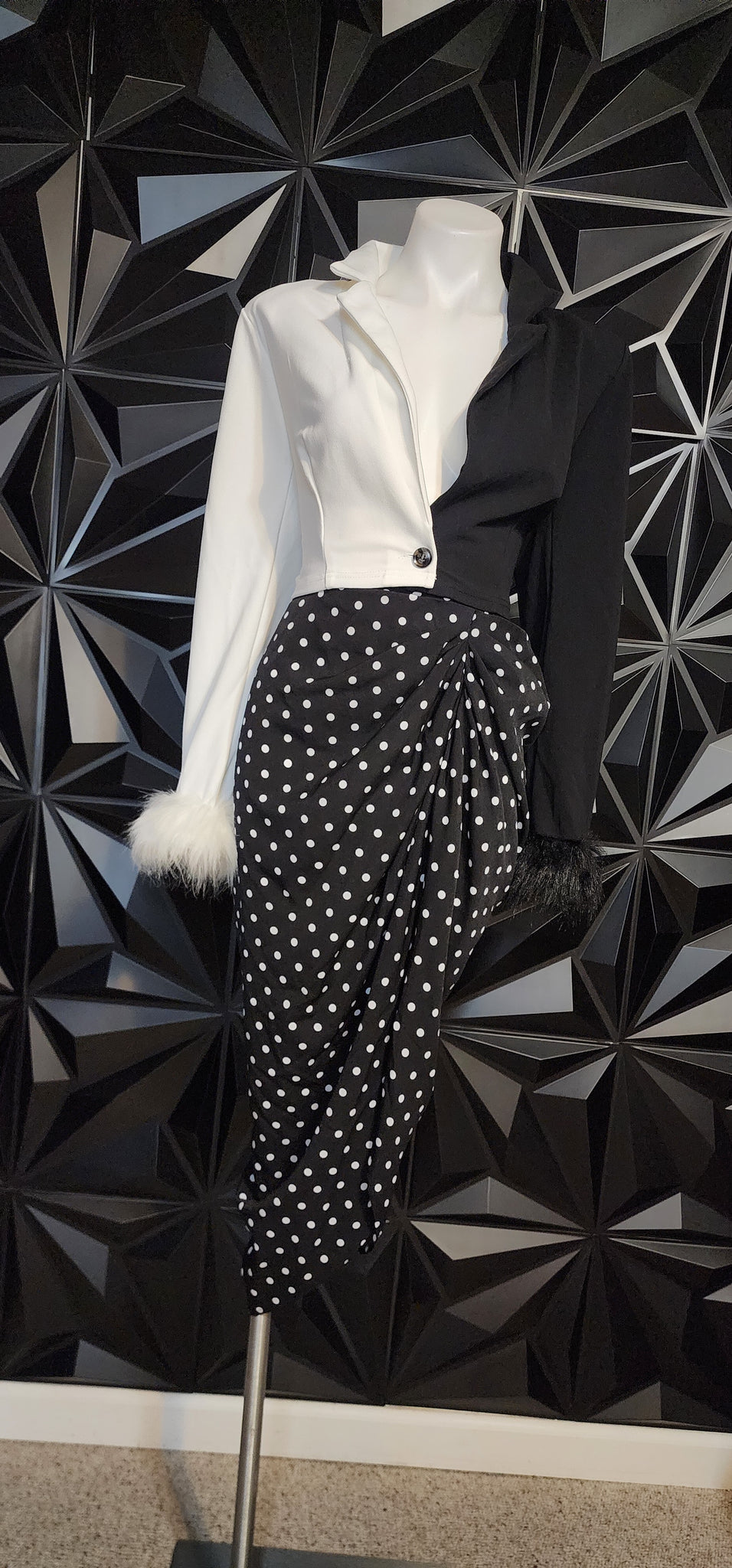 SHEIN HALF AND HALF  BLACK AND WHITE CROPPED BLAZER. THIS BLAZER IS A SIZE LARGE, BEST FITTING SIZE 10 TO BUTTON CLOSED. IT DOES HAVE STRETCH