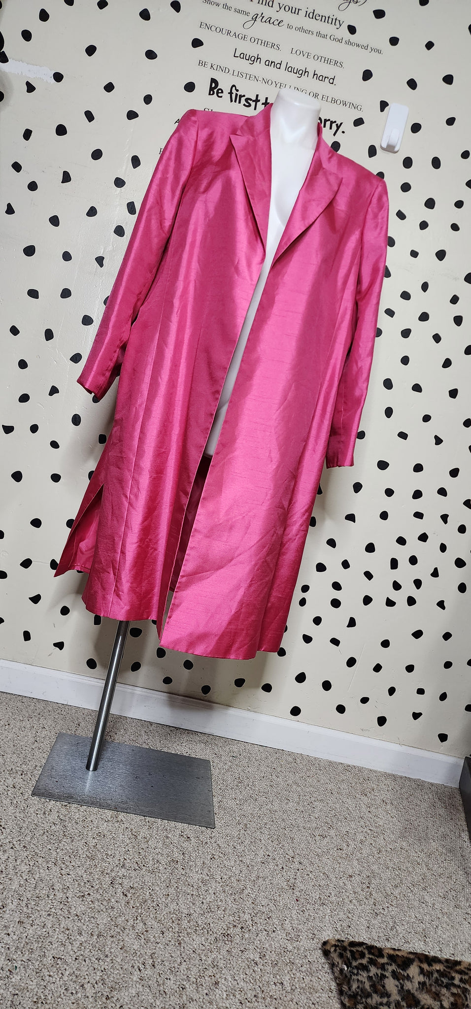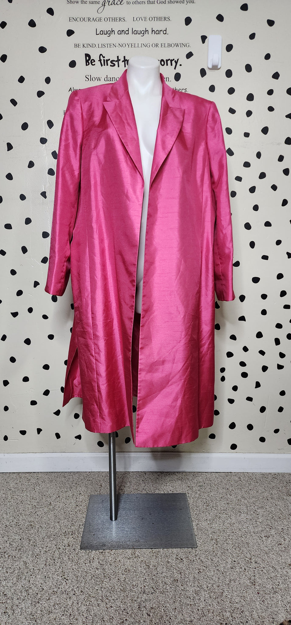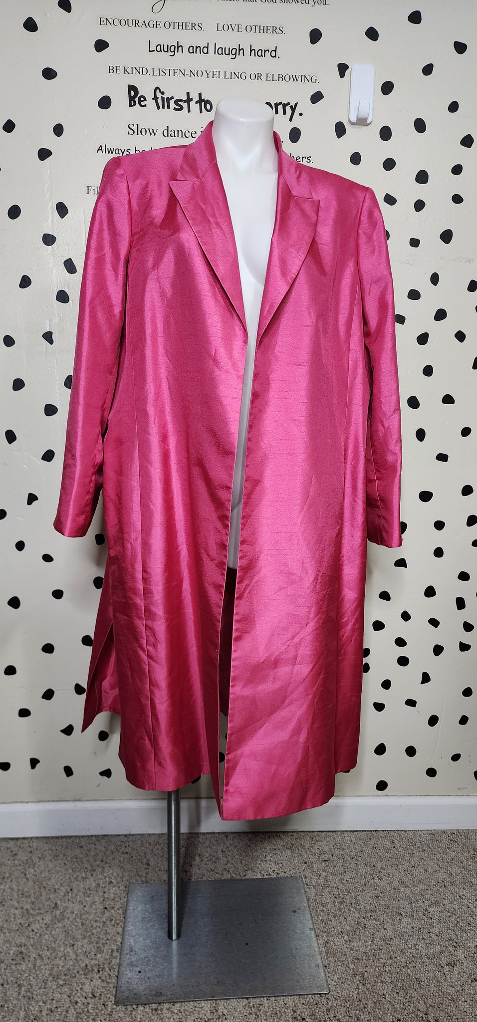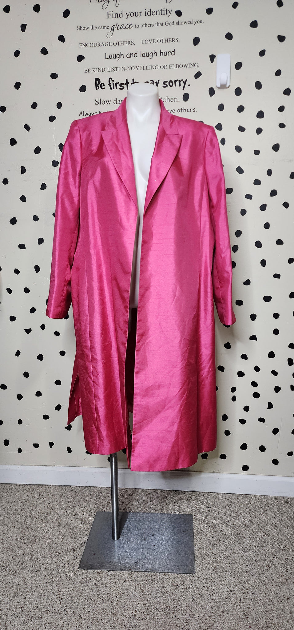 SUIT STUDIO OPEN FRONT PINK BLAZER. THIS BLAZER IS A SIZE 20, FITTING XLRG-2X. SPLITS ON THE SIDE. SHOULDER PADS INSIDE.