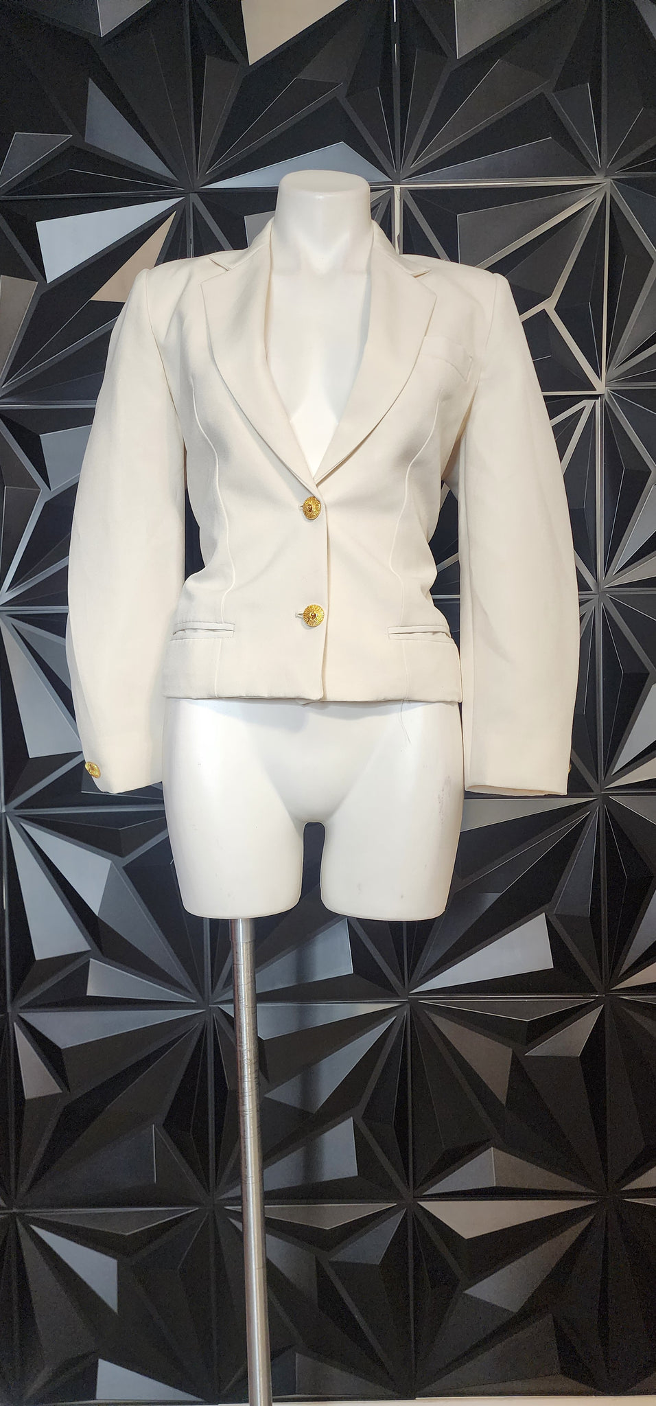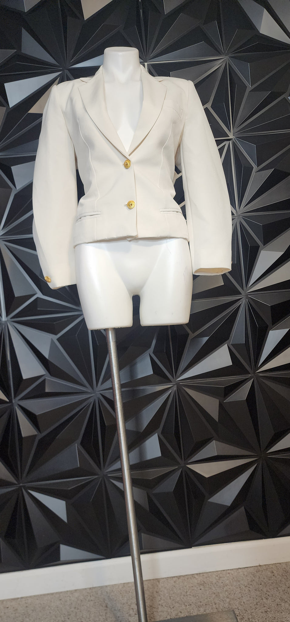 WHITE PETITE BLAZER. UNBRANDED AND UNTAGGED. THIS BLAZER BEST FITS A SIZE MEDIUM (8). LIGHT SHOULDER PADS.