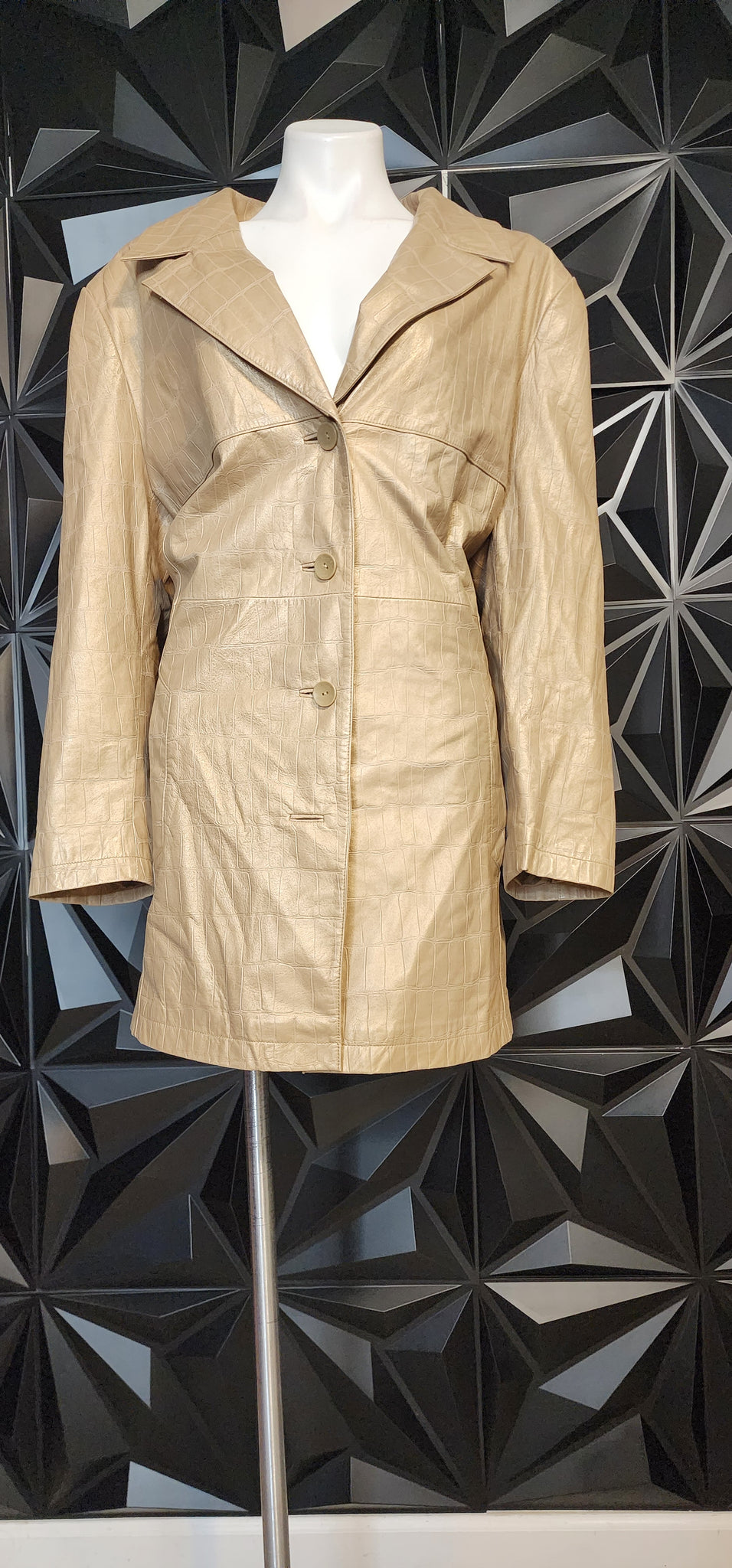 WILSONS LEATHER COAT. GOLD IN COLOR. BUTTON FRONT. THIS LEATHER JACKET IS A SIZE 1X