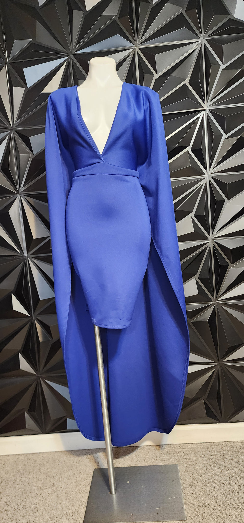 BLUE CAPE DRESS. TAGGED A SIZE 3X, BEST FITTING A SIZE 16. IT DOES HAVE STRETCH