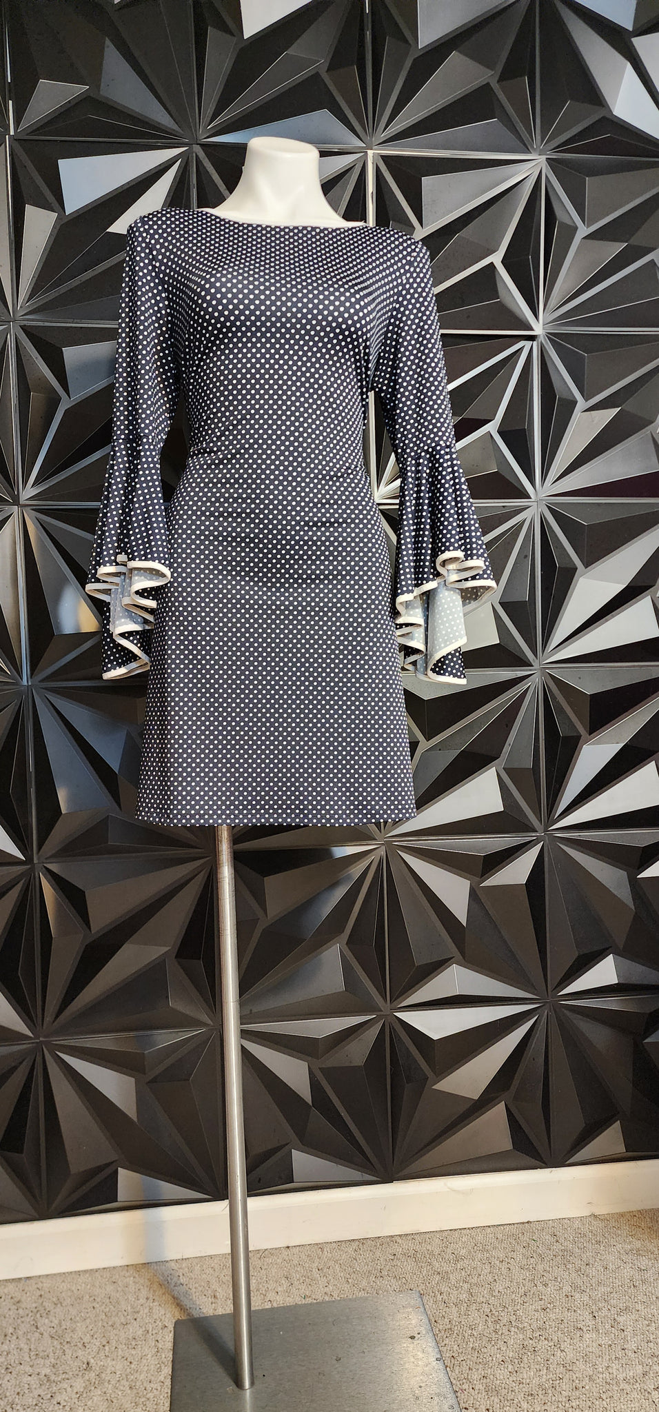 Msk Navy and white polka dot dress with bell sleeves. This polka dot dress is a size medium with stretch to fit up to sz large
