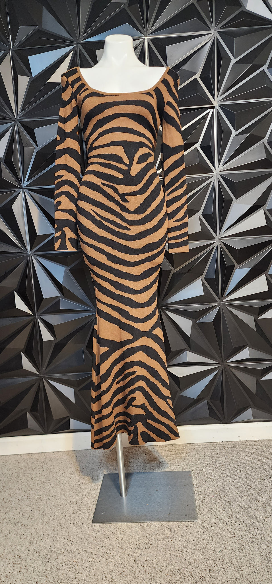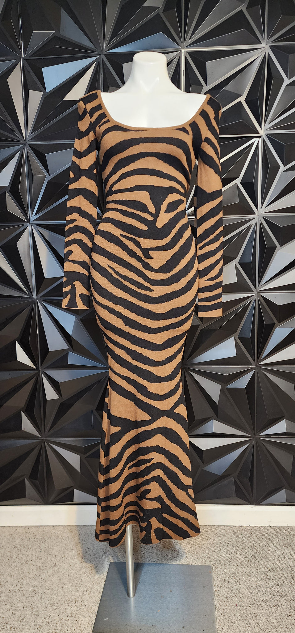New with tag Brown and black stripe print mermaid dress. This dress is tagged a size medium, best fitting sz small/medium. Does have stretch