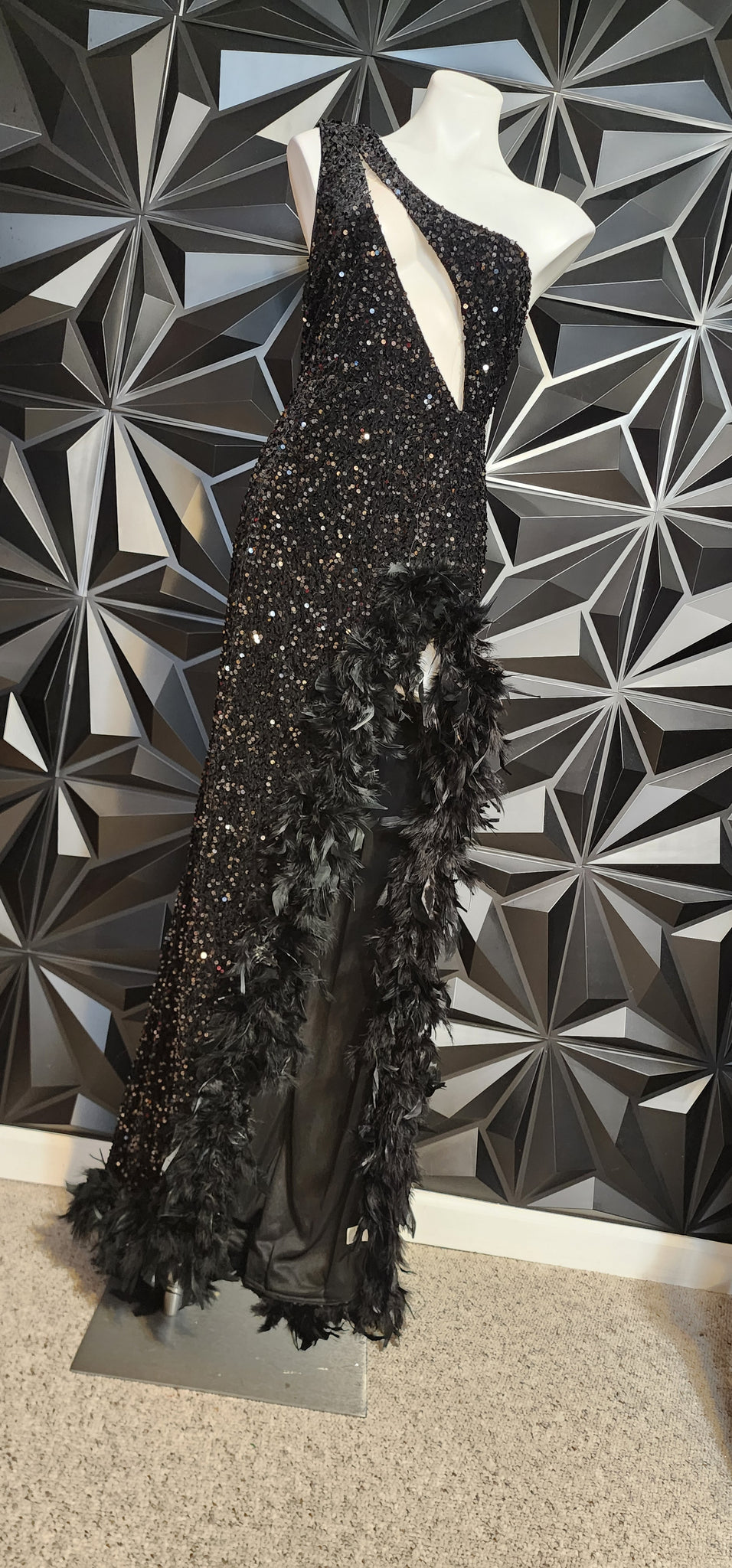 NEW WITH TAGS BLACK FASHION NOVA SEQUIN FUR GOWN. THIS GOWN ZIPS UP THE BACK. HAS STRETCH. HIGH SPLIT. TAGGED A SIZE 1X, BEST FITTING SZ 12/14.