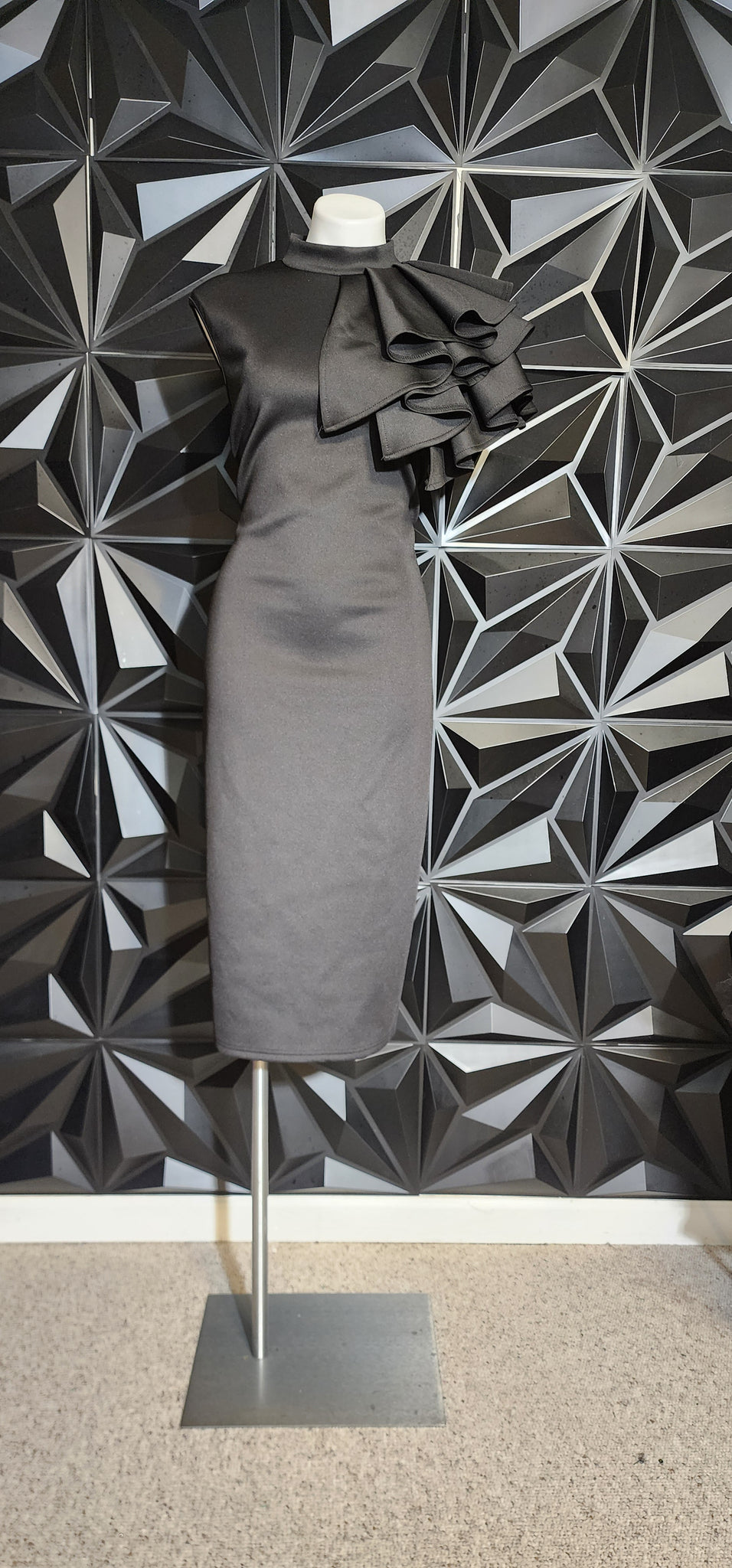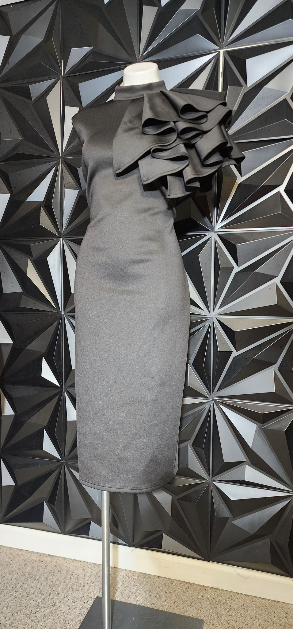 Black ruffled shoulder dress. Zips up the back. Tagged a size xl, best fitting sz 12.  This dress does have stretch
