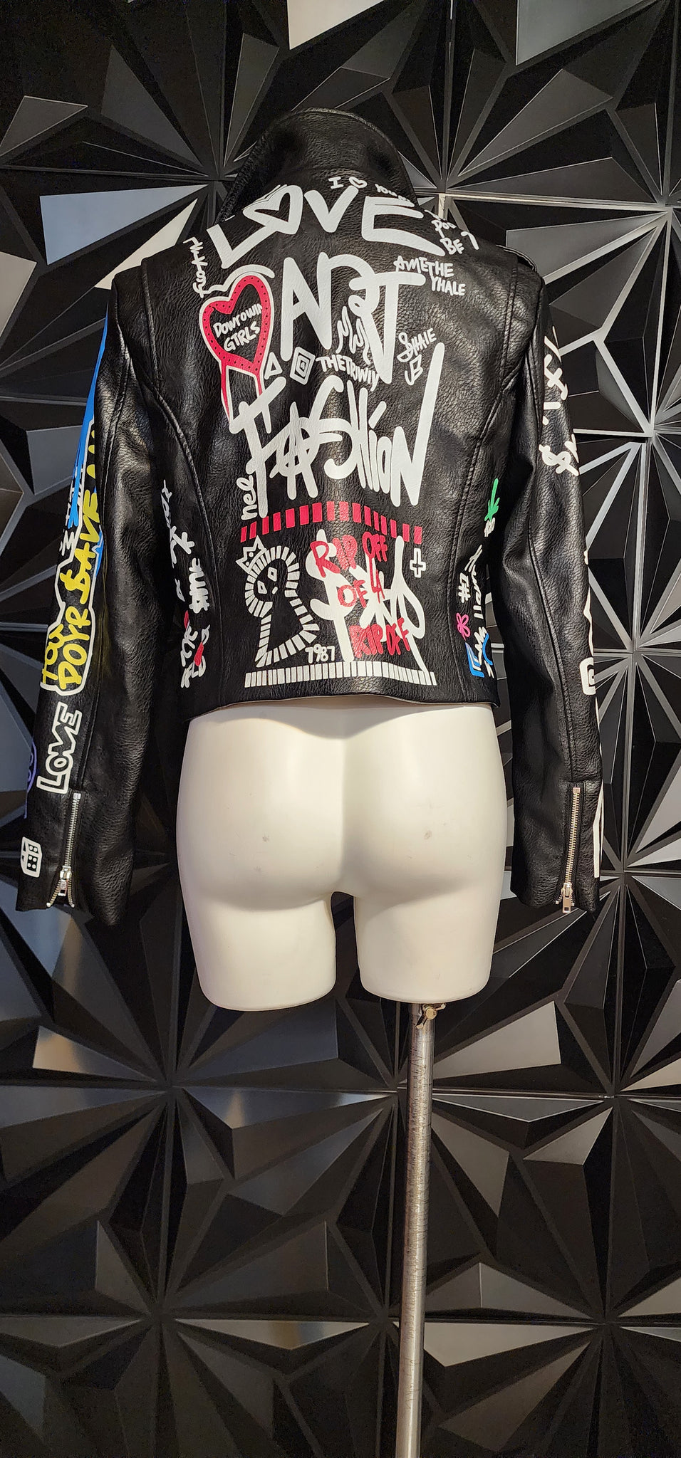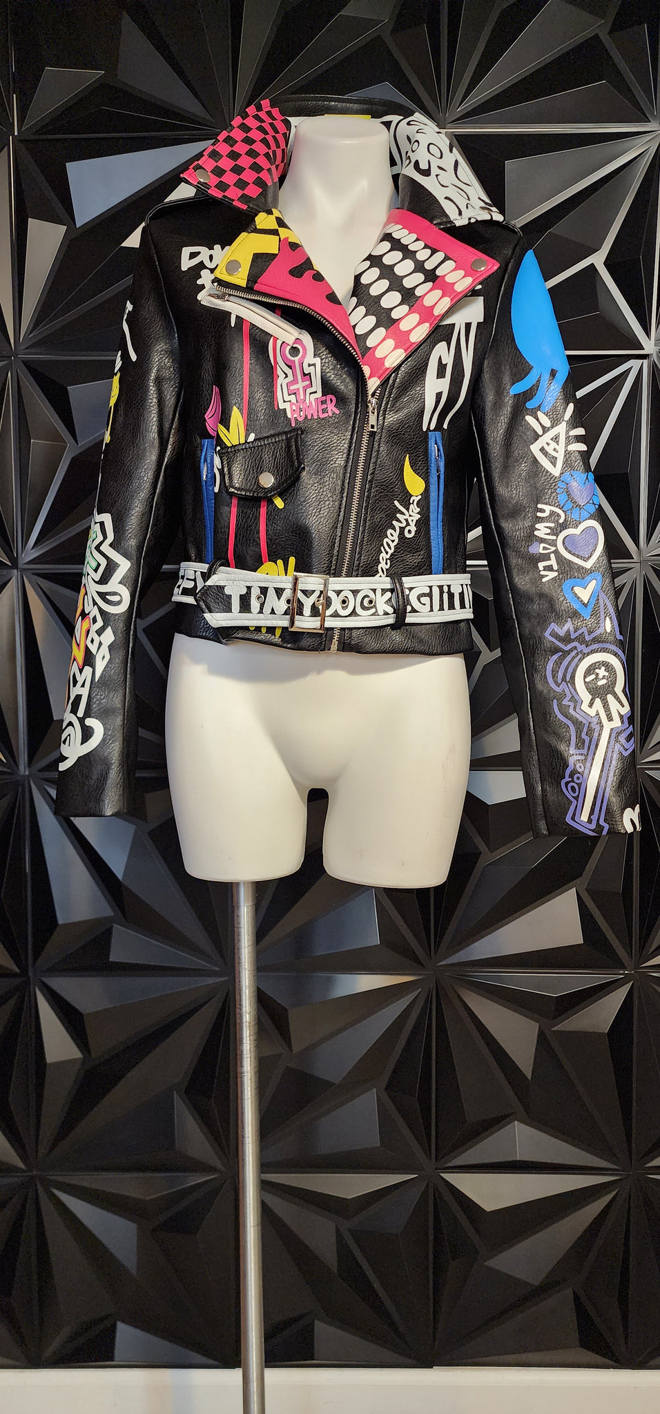 AZAELA WANG LEATHER MOTO JACKET. ZIP UP THE FRONT, WITH FRONT ZIP POCKETS. TAGGED A SIZE LARGE (8 to NO LARGER THAN SZ 10)