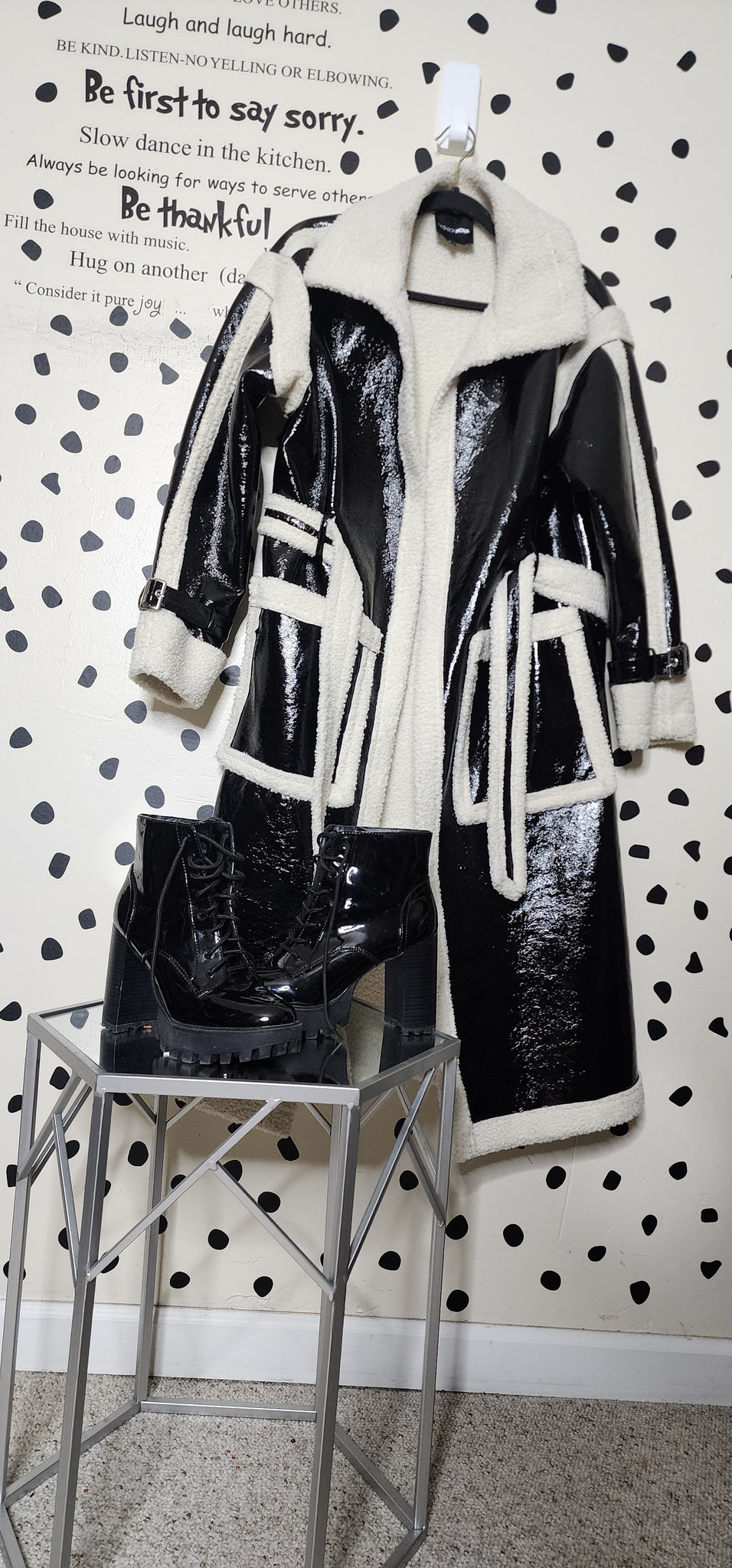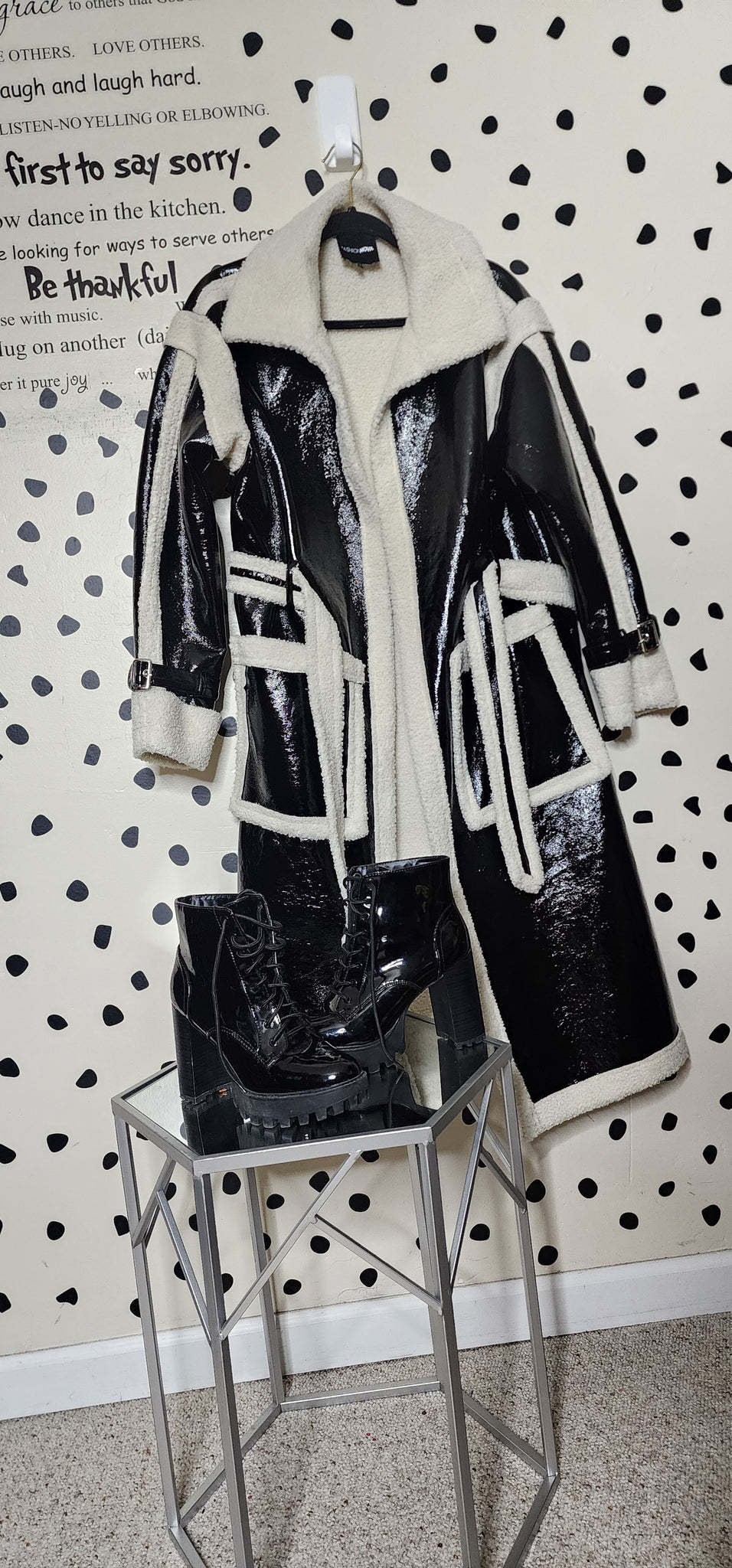 FASHIONNOVA PATENT LEATHER TRENCH. THIS COAT COMES WITH BELT CLOSURE. IT IS A SIZE LARGE FITTING UP TO SIZE 14