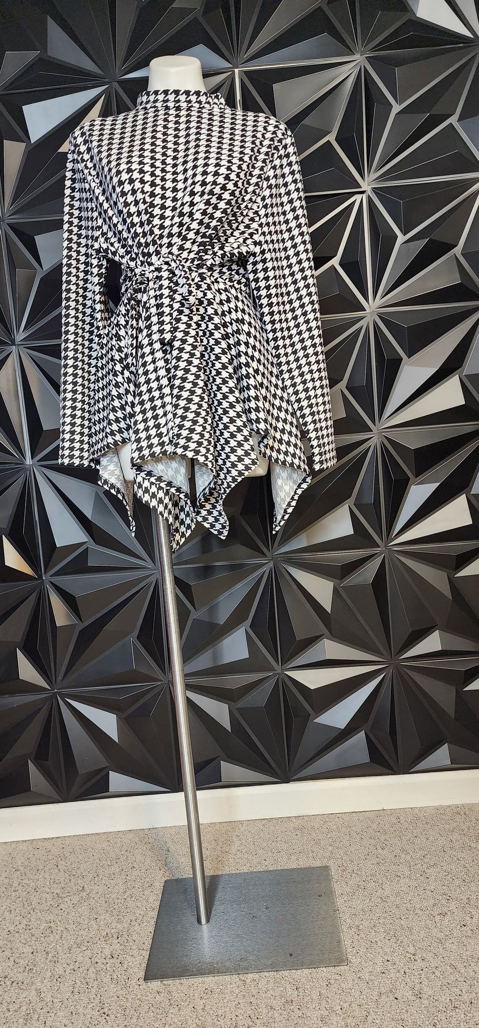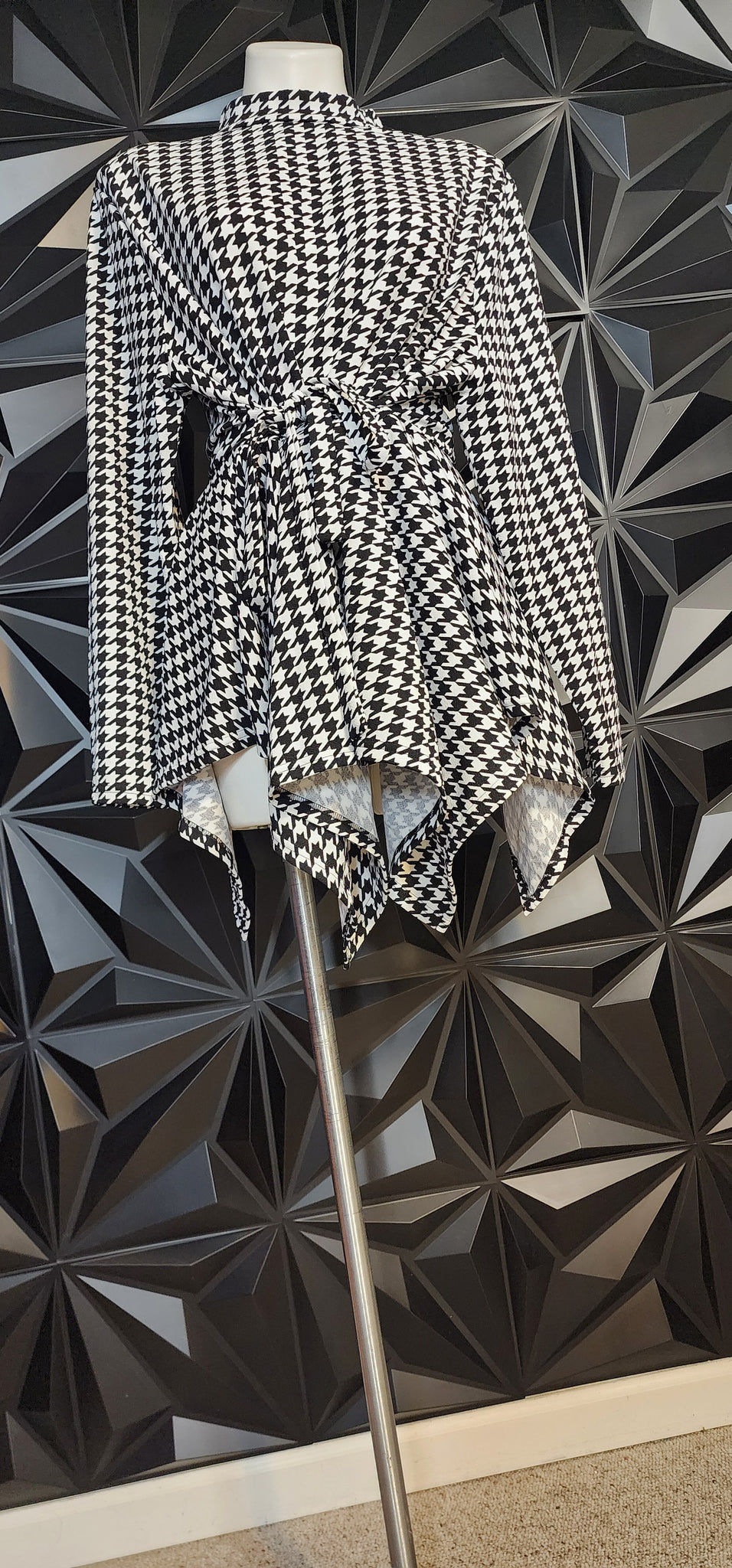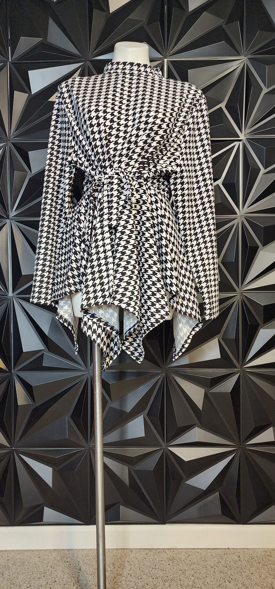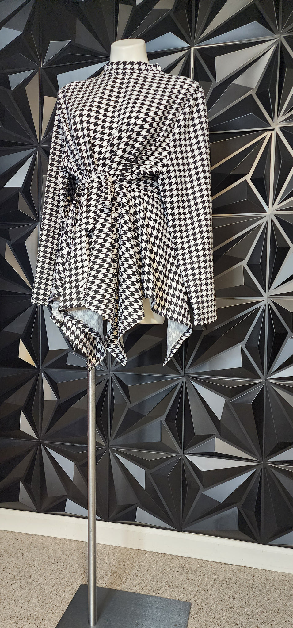 HOUNDSTOOTH TOP WITH BELT. UNBRANDED AND UNTAGGED. BEST FITTING A SIZE 1X-3X. HAS STRETCH