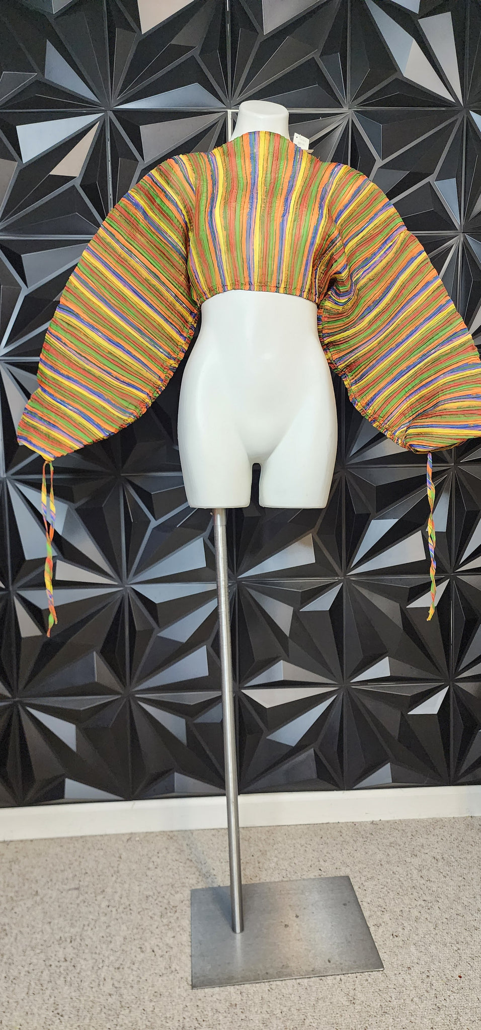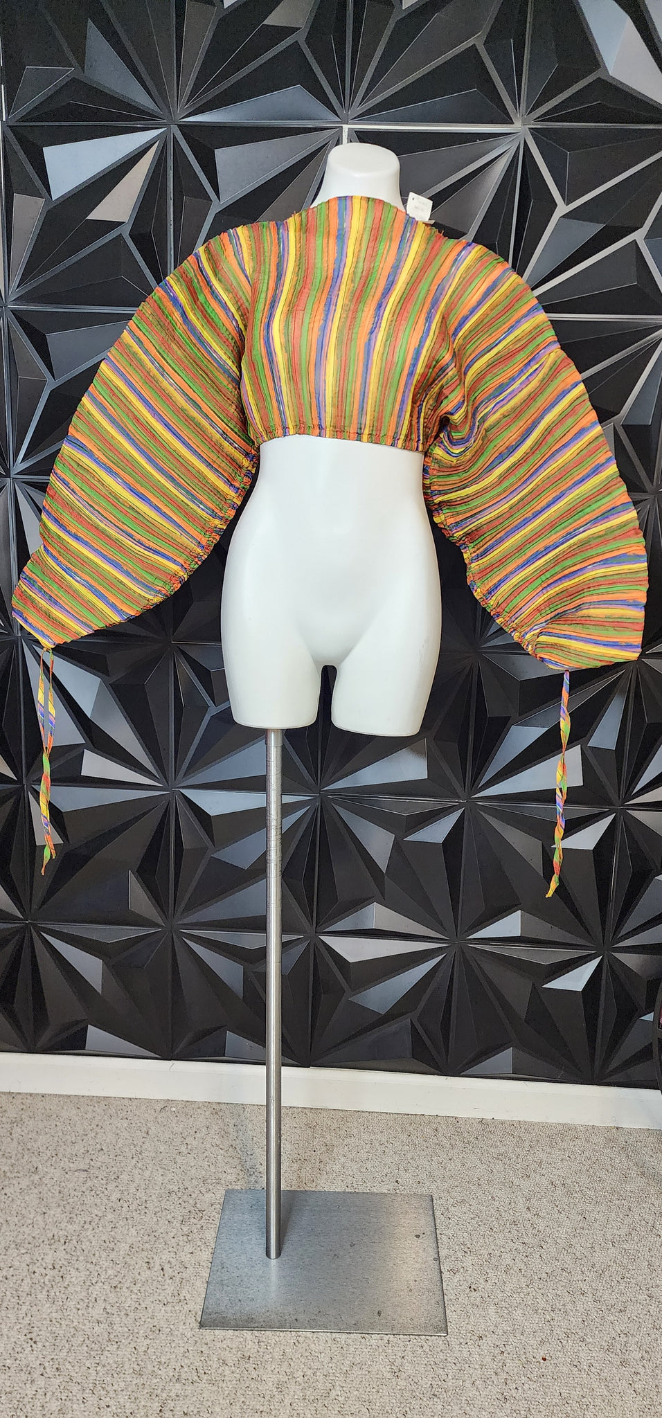 New with tags colorful stripe crop top. Wide dramatic arms. Has some stretch. Tagged a size medium fitting up to a size large