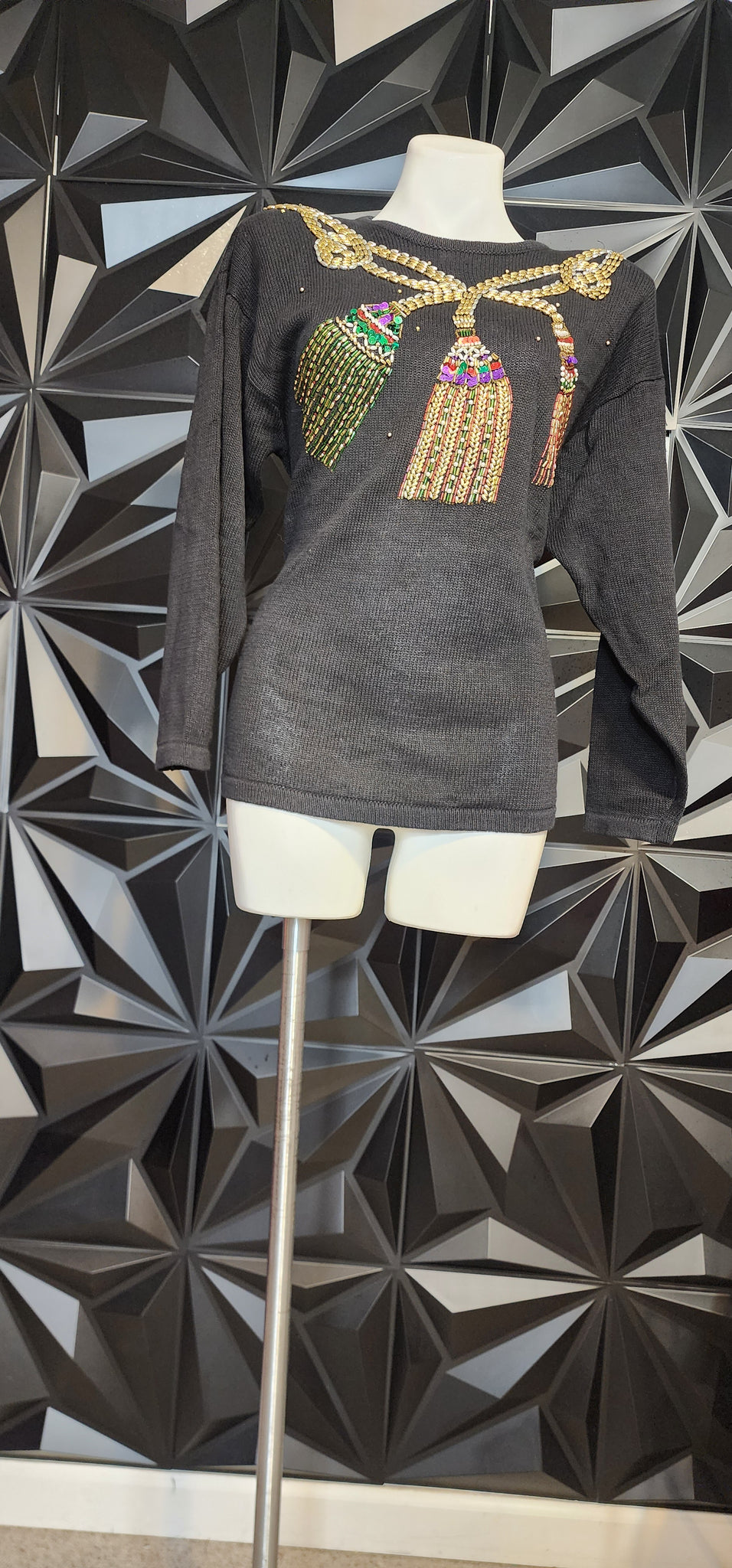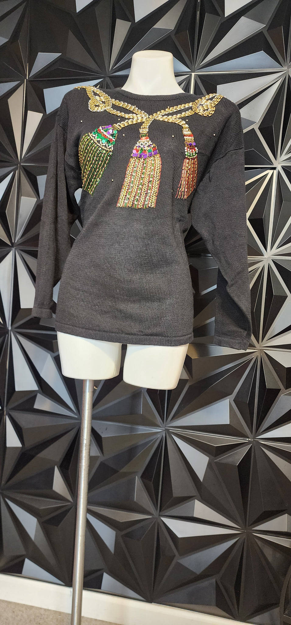 PA International vintage beaded sweater. this sweater has stretch. It is tagged a size medium fitting up to a size large. Has shoulder pods inside