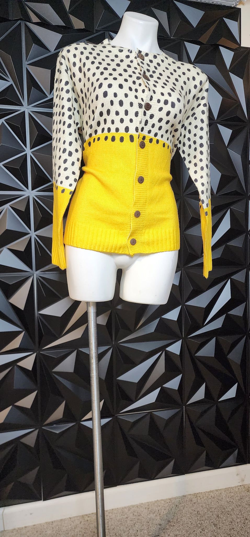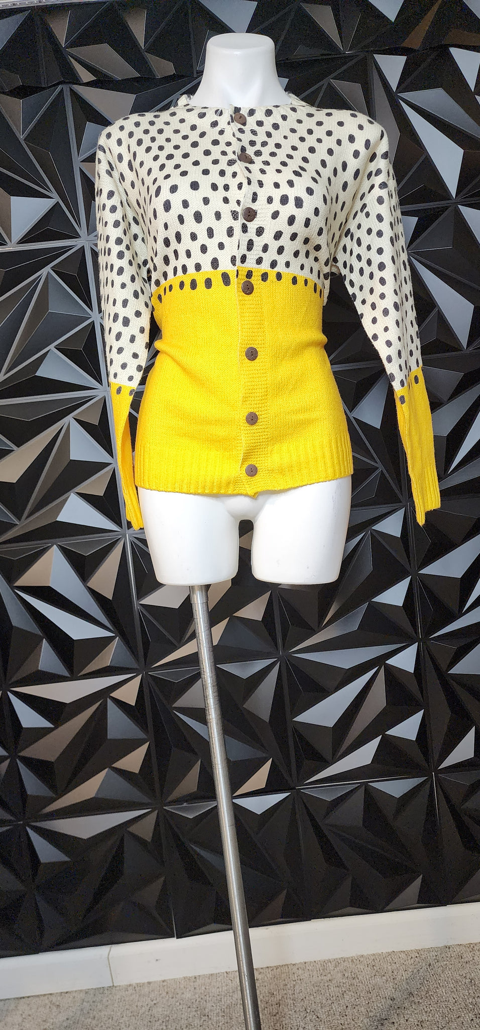 Polka dot cardigan. Button down the front. Has stretch. Tagged a size medium fittin up to large