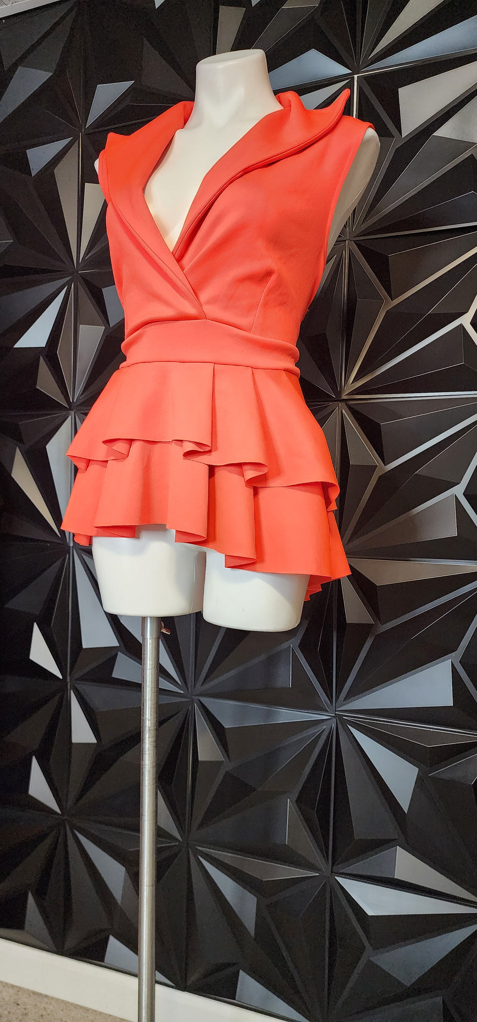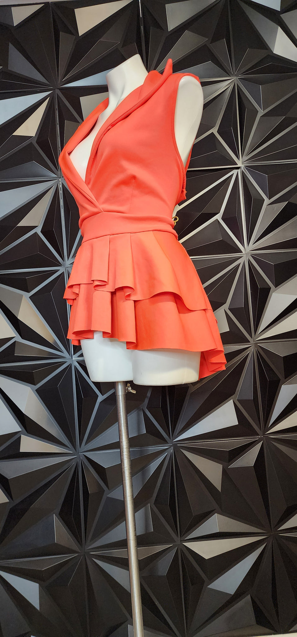 VENUS ORANGE HIGH LOW RUFFLED BOTTOM TOP. TAGGED A SIZE 1X WITH GREAT STRETCH TO FIT UP TO A SIZE 2X. PULL OVER THE HEAD TOP