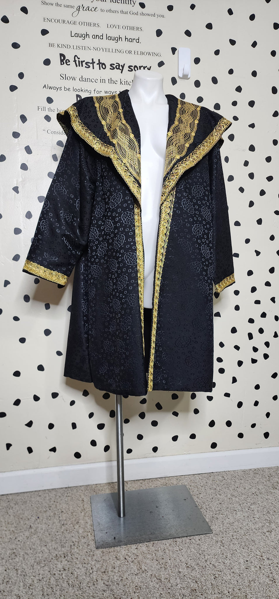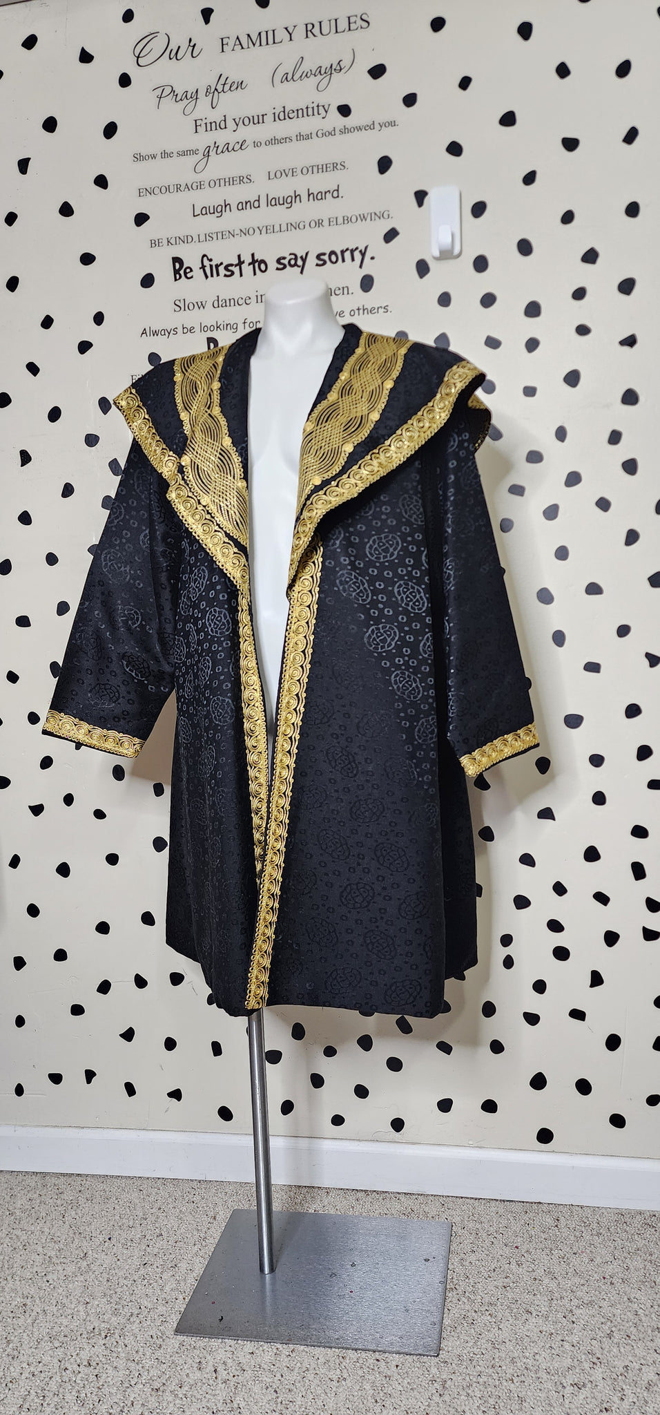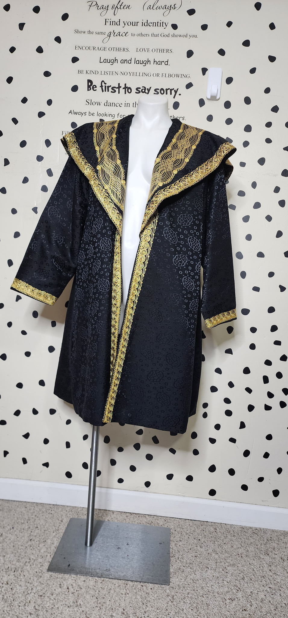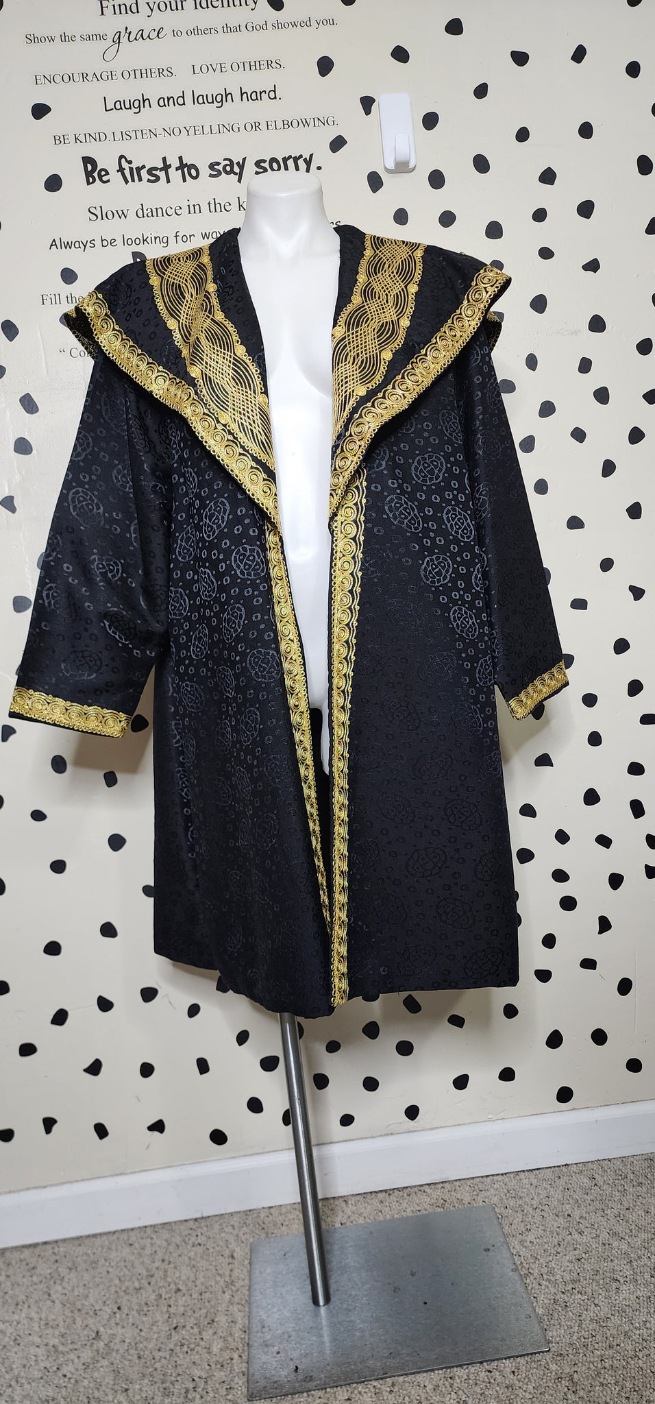 AFRICAN VILLAGE QUEEN OPEN FRONT DUSTER. BLACK AND TRIMMED IN GOLD THROUGHOUT. THIS DUSTER IS ONE SIZE FITTING A SIZE XLRG-3X. REMOVABLE SHOULDER PADS