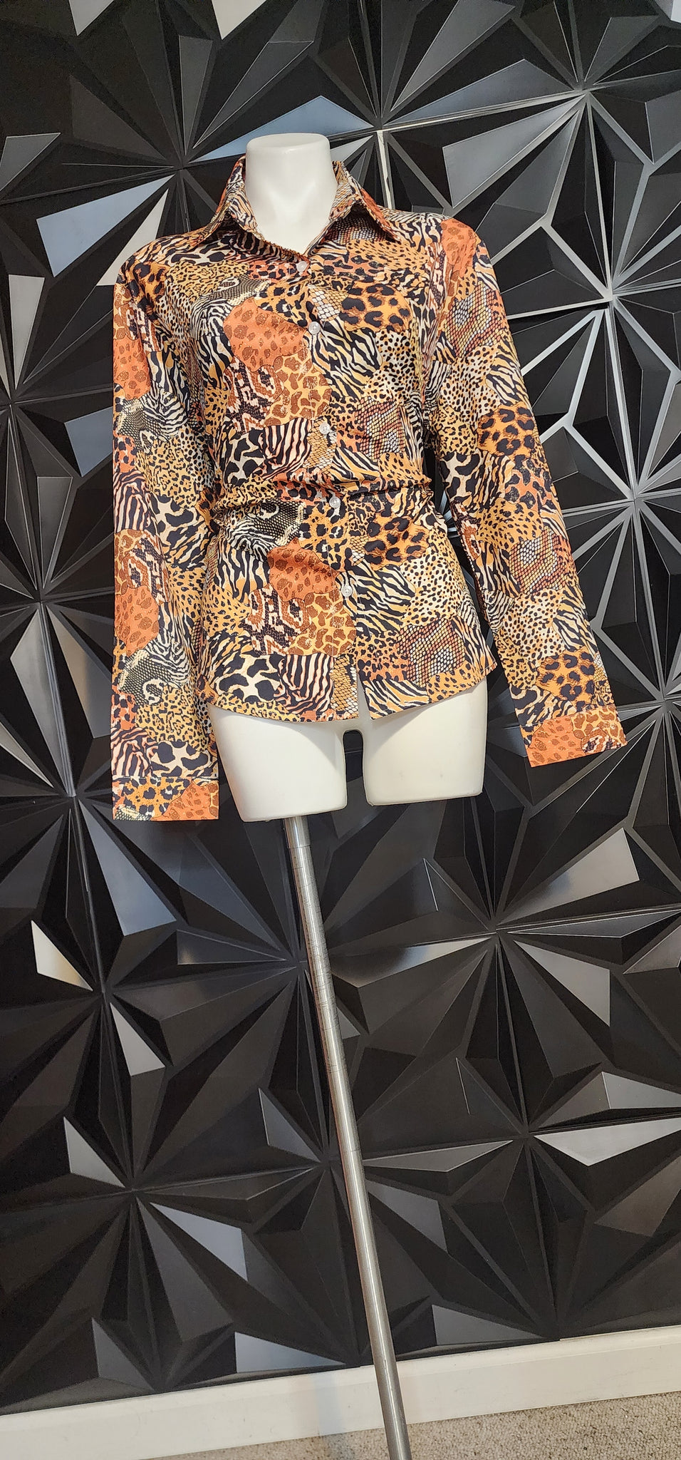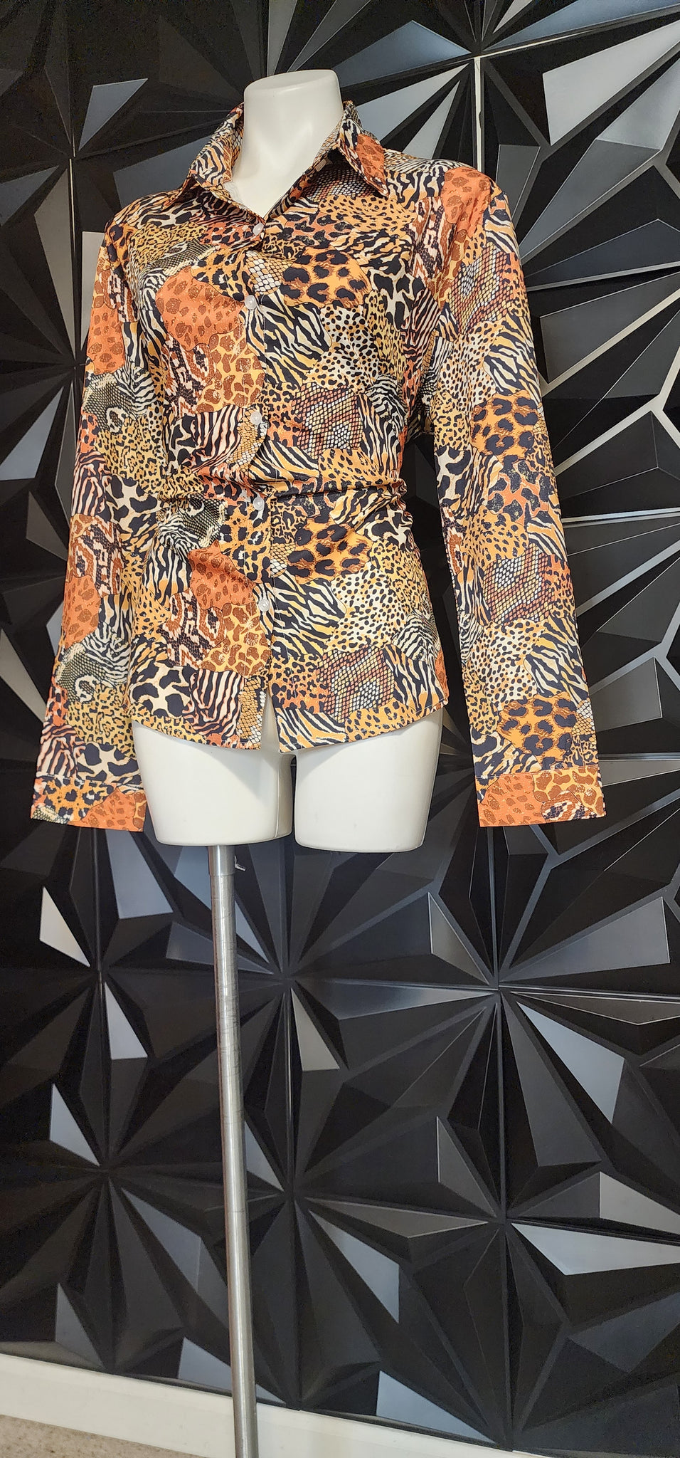 ANIMAL PRINT BUTTON DOWN TOP. UNBRANDED. LIGHTWEIGHT. THIS TOP IS TAGGED A SIZE XXL, BEST FITTING SIZE 14/16