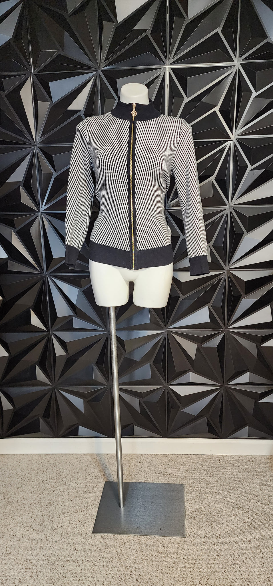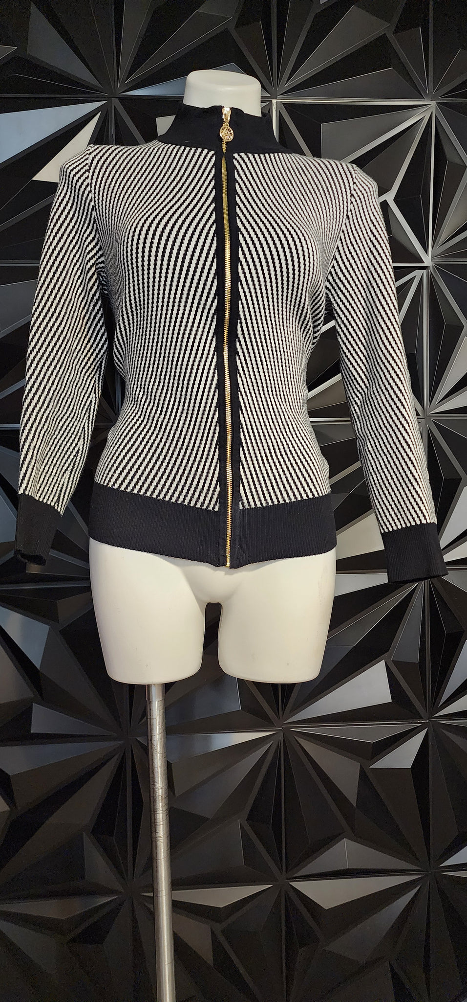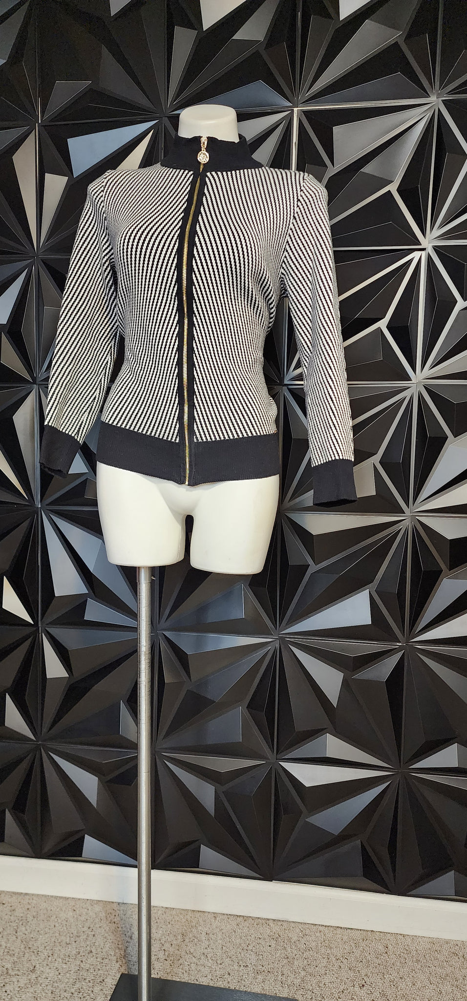 ANNE KLEIN STRIPE CARDIGAN. ZIPS UP THE FRONT. THIS CARDIGAN IS A SIZE SMALL WITH STRETCH TO FIT UP TO A SIZE MEDIUM