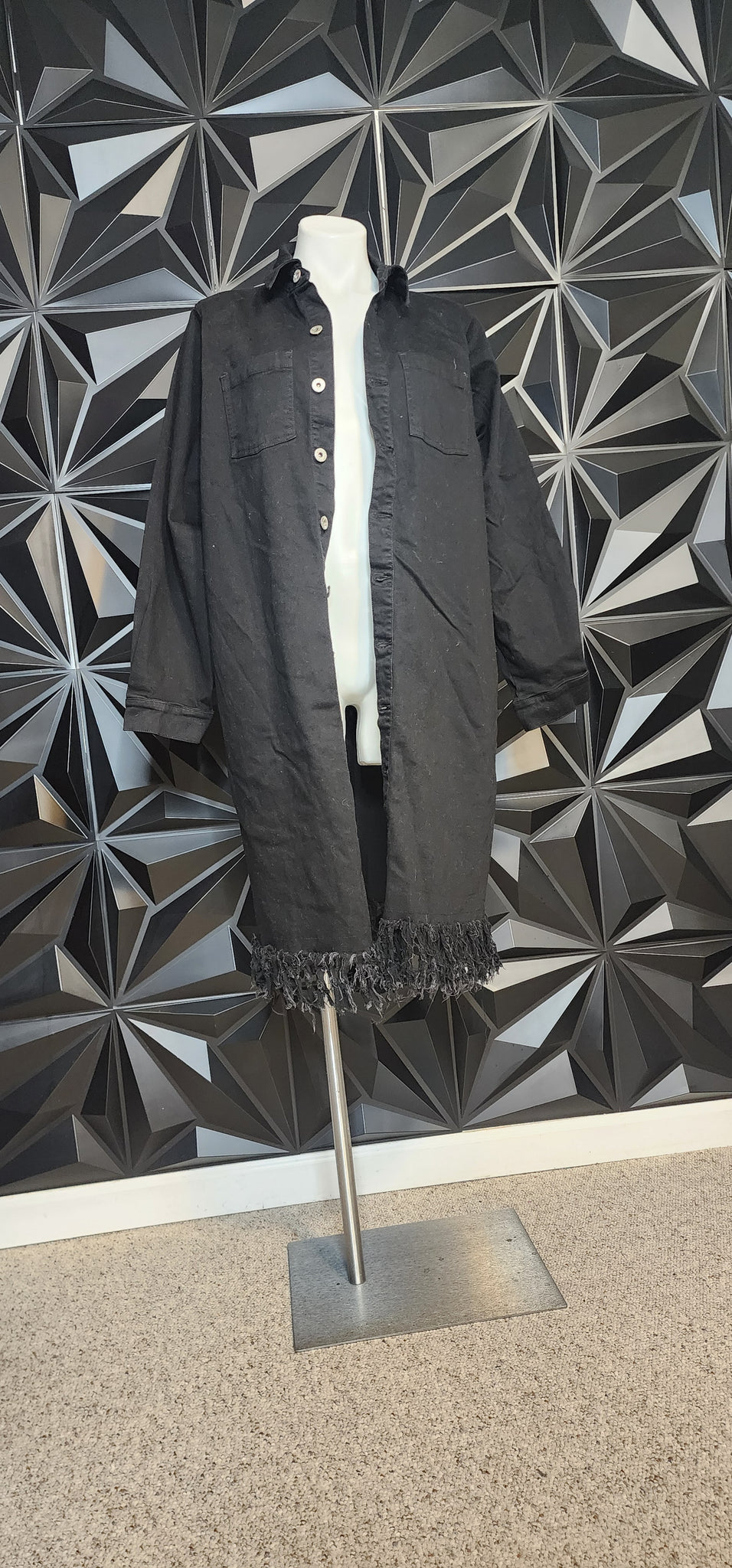 ASHLEY STEWART LONG FRINGE BOTTOM DUSTER. CAN ALSO BE WORN AS A DRESS. THIS DUSTER IS A SIZE 14 AND DOES HAVE STRETCH TO FIT UP TO SZ 16