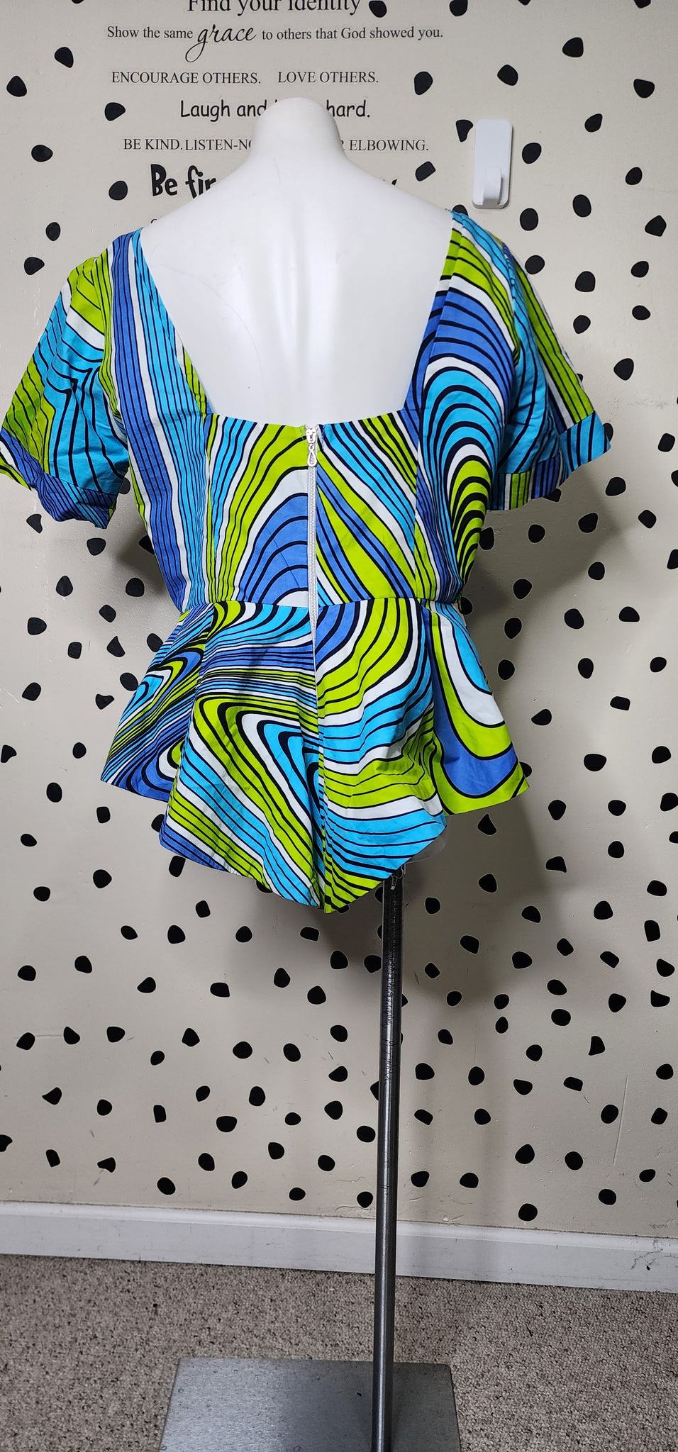 BLUE AND LIME GREEN PEPLUM TOP. ZIPS IN THE BACK. NO STRETCH. BEST FITTING A SIZE 12/14.
