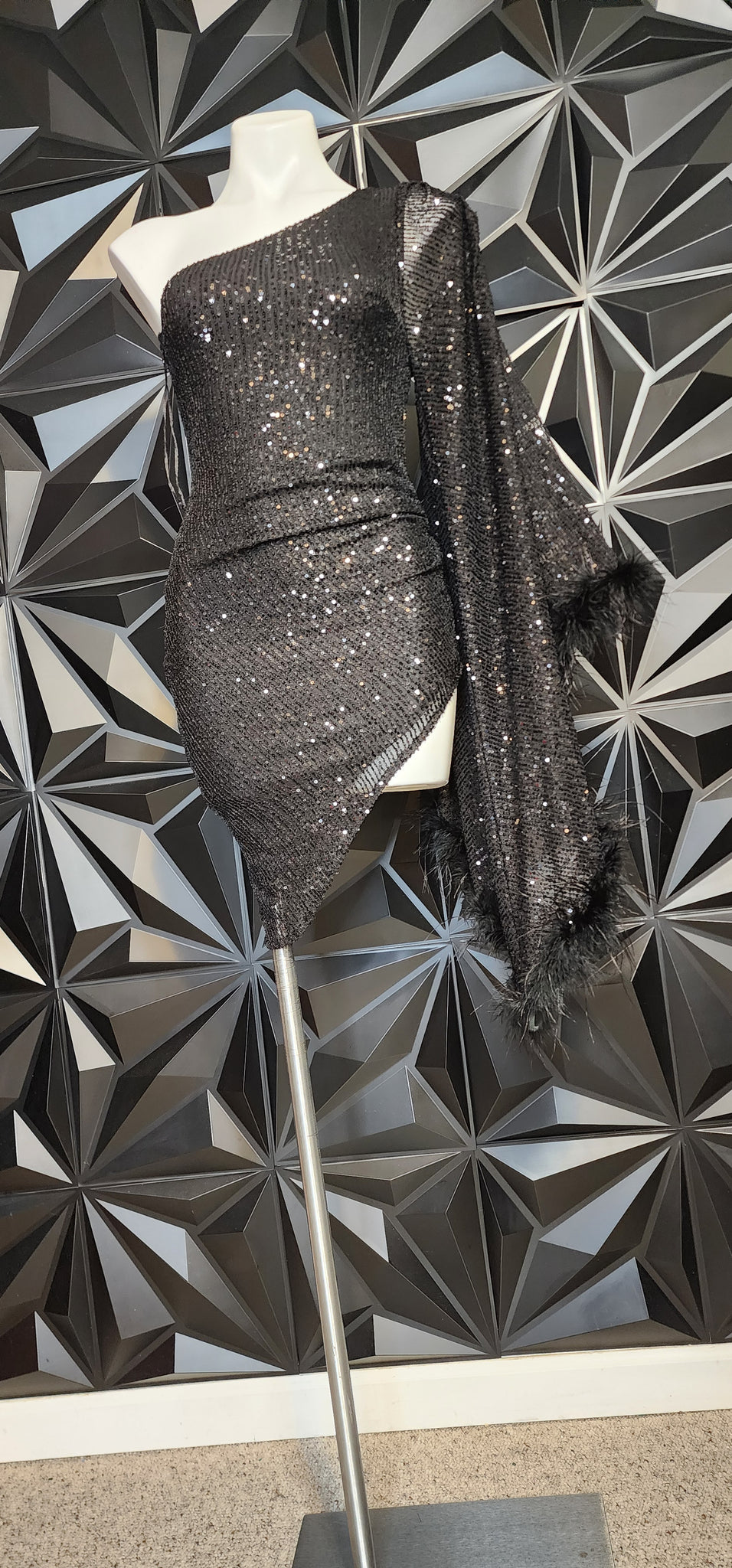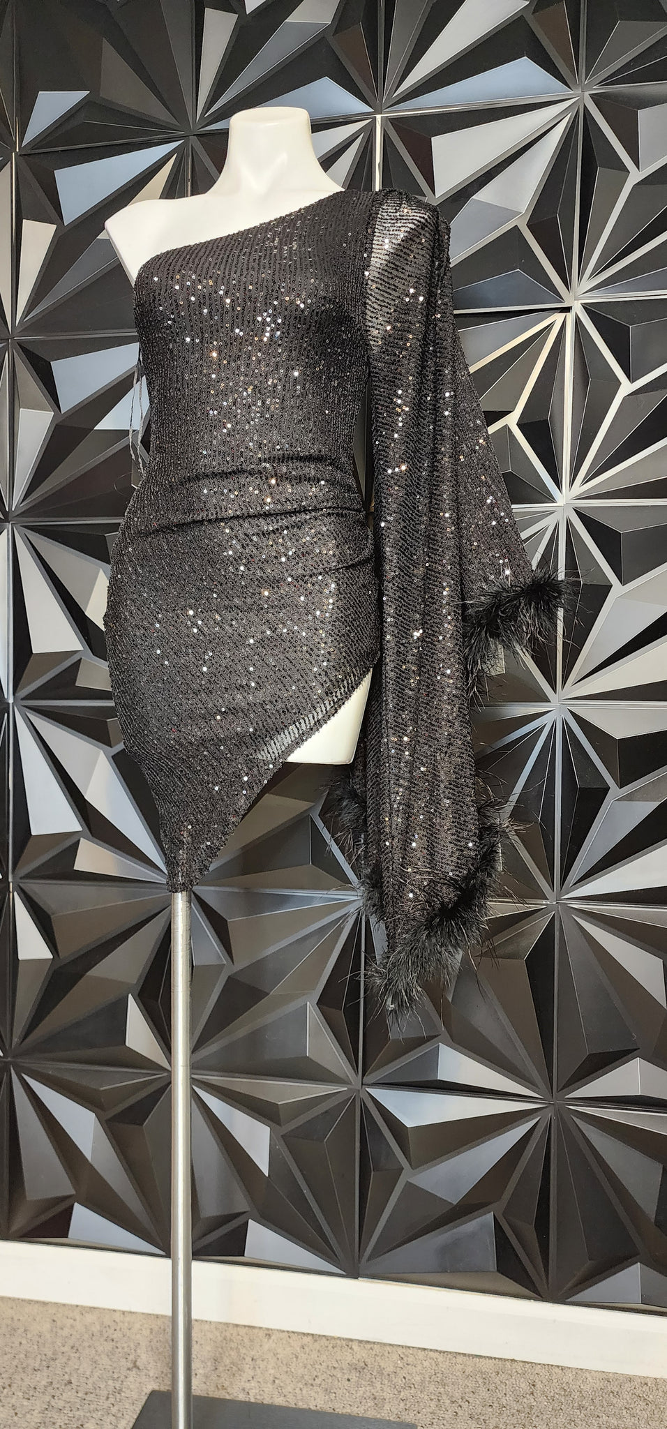 FASHION NOVA 1 ARM SEQUIN DRESS. UNTAGGED, BEST FITTING A SIZE SMALL (4-6). HAS SOME STRETCH. ZIP UP THE SIDE