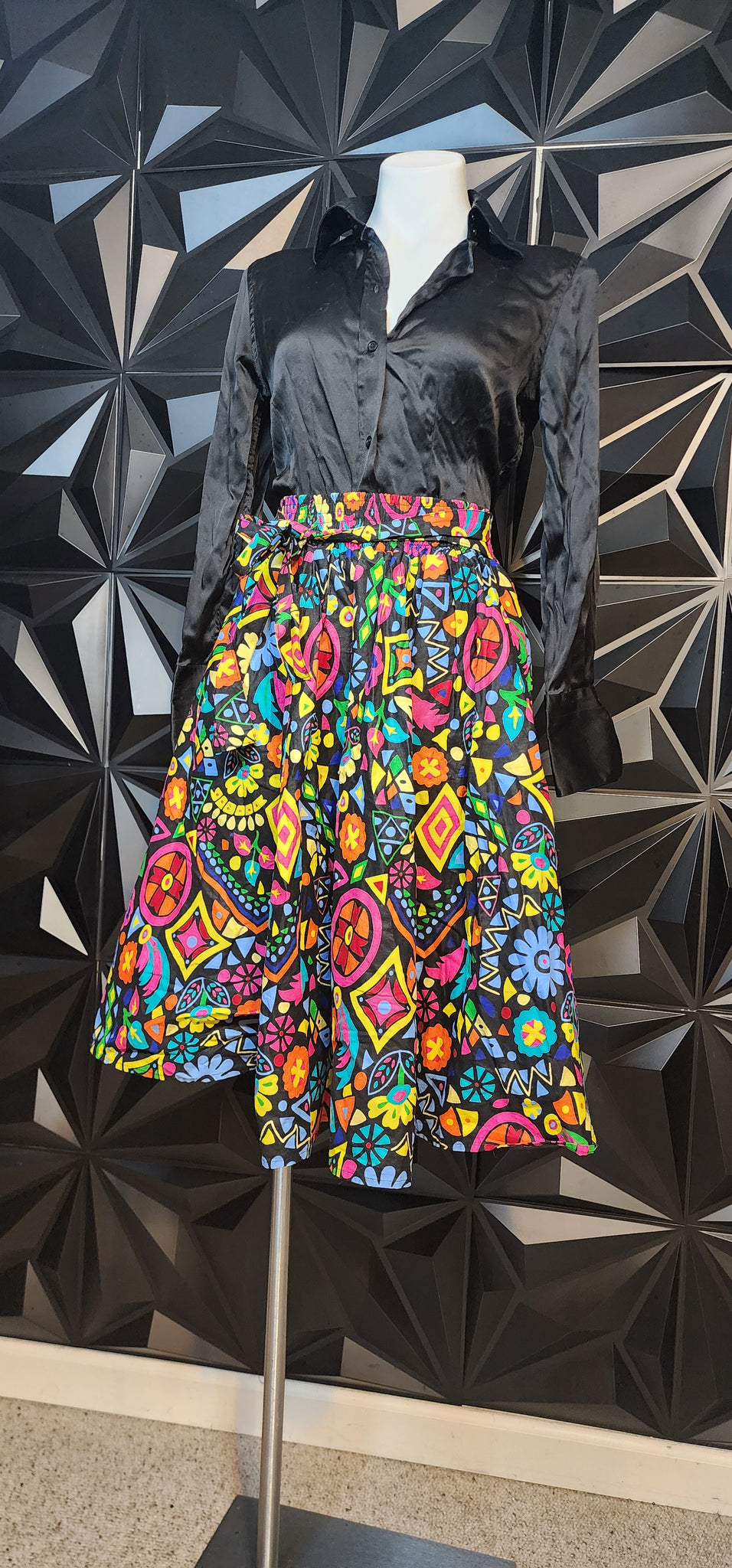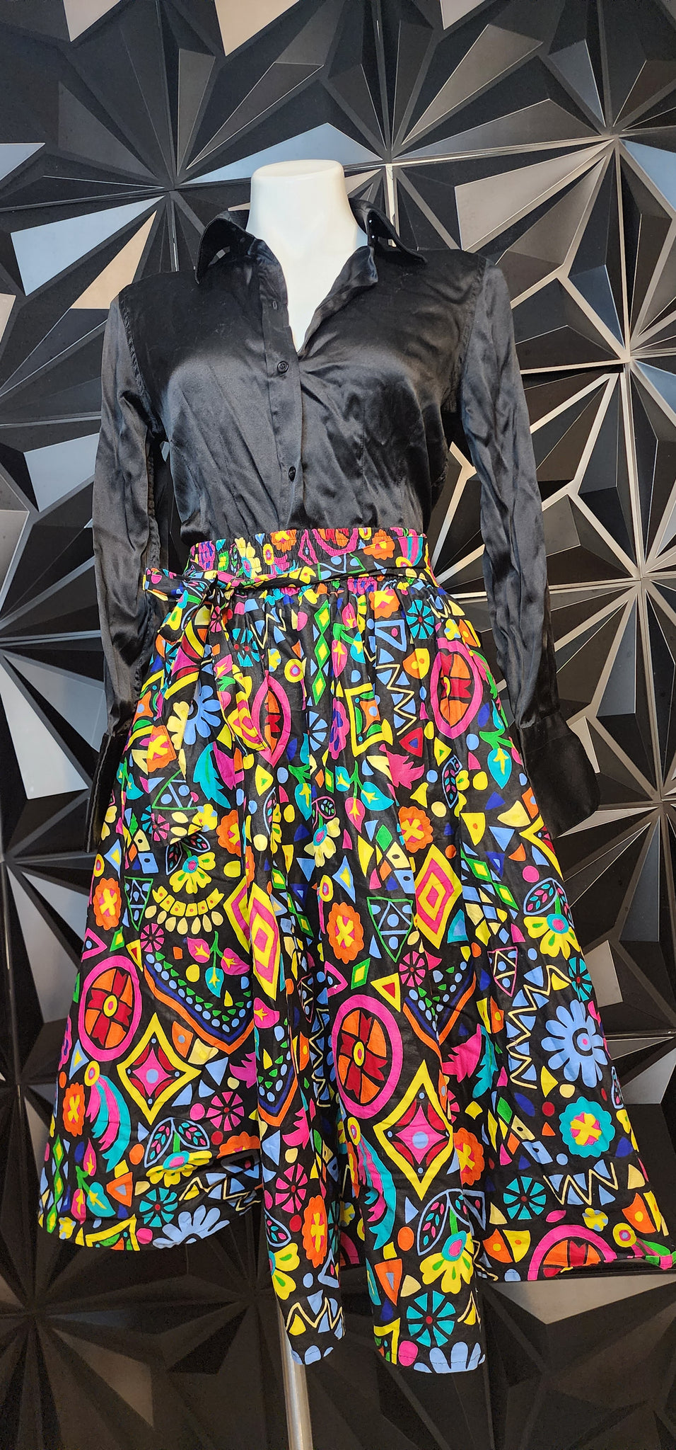Multicolor fit and flare skirt w attached belt. Tagged one size, Best fitting sz sm-large. Elastic waist.