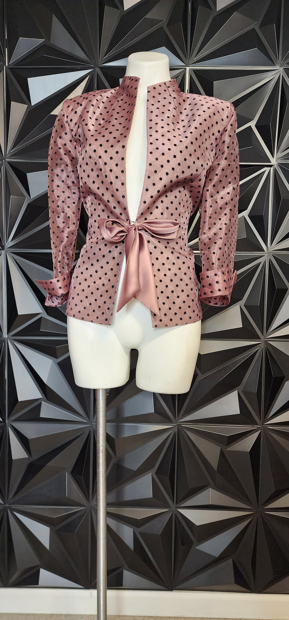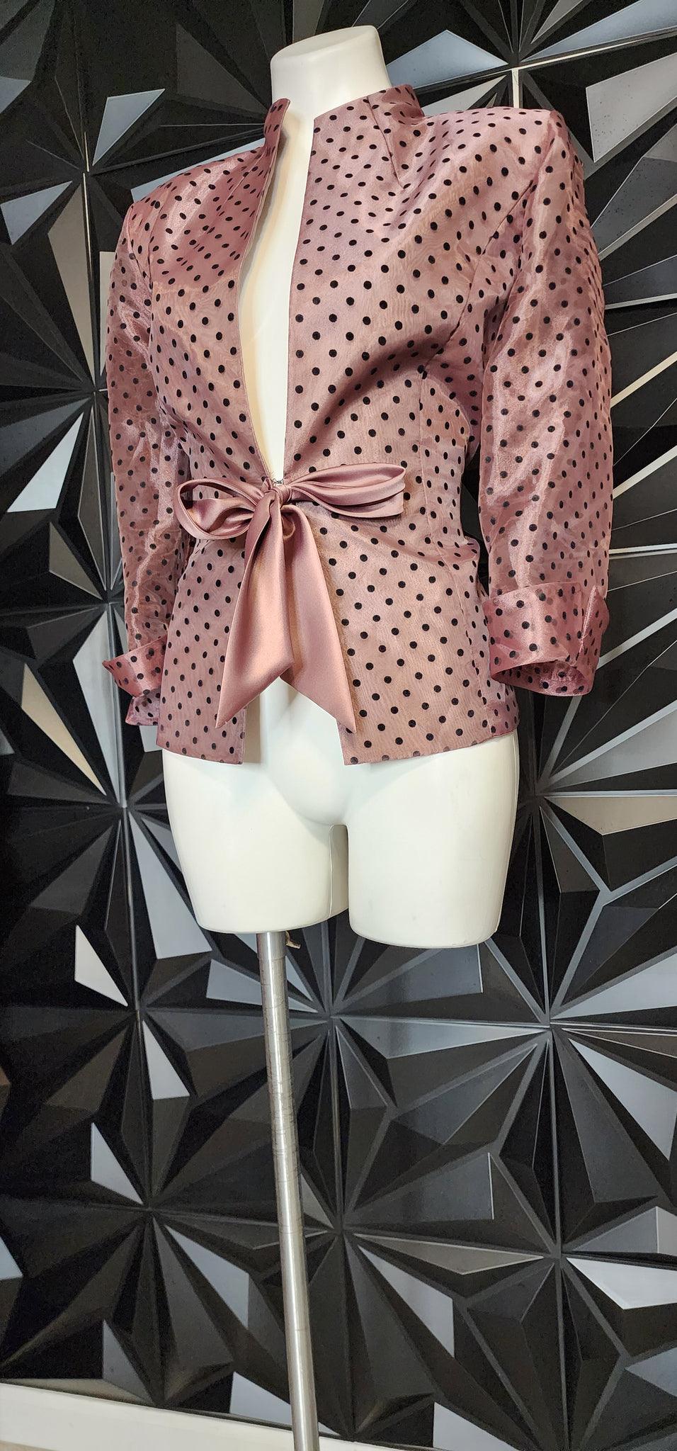 R&M Richards polka dot top. Clasp closure and tie at the waist. light shoulder pads. Size 12, best fitting a size 10.