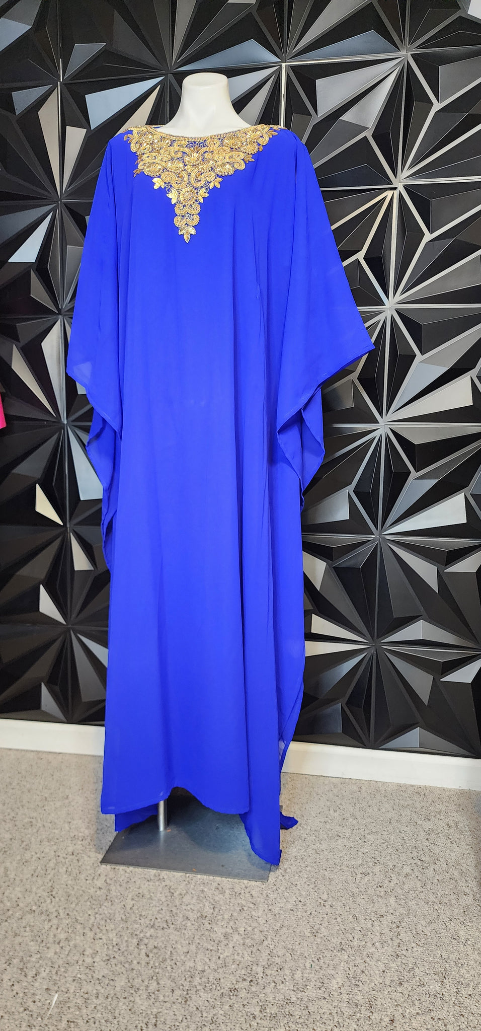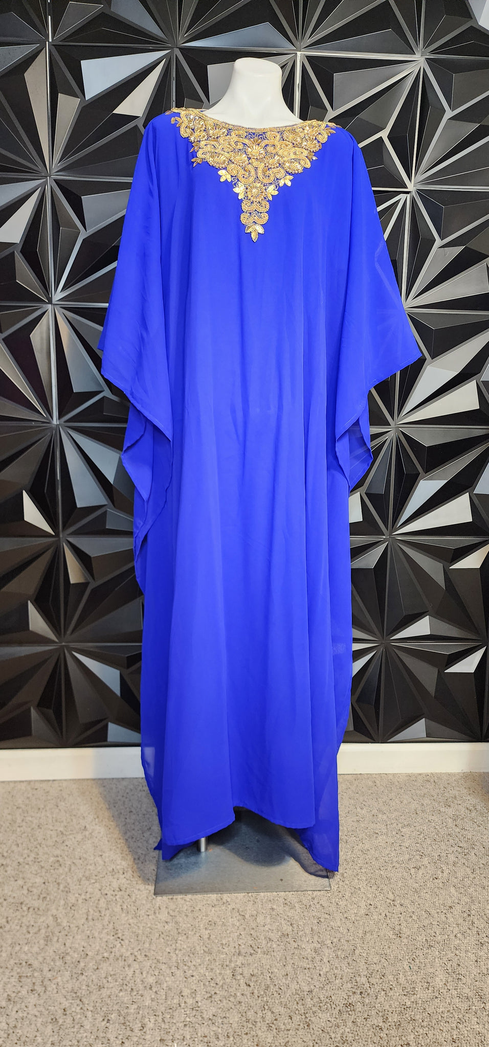 ANNIE ROYAL BLUE GOWN. GOLD BEADED NECK TRIMMINGS. THIS GOWN BEST FITS A SIZE LARGE-1X. LINING INSIDE