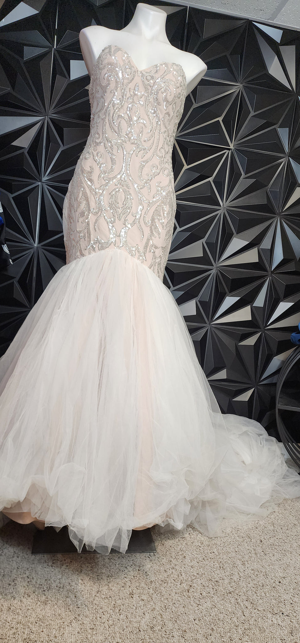 Sequin Wedding dress with Tulle bottom and extended train in back. Zips up the back. Has some stretch. This wedding Dress is tagged a size 14, Best fitting a size 8/10. See measurements.