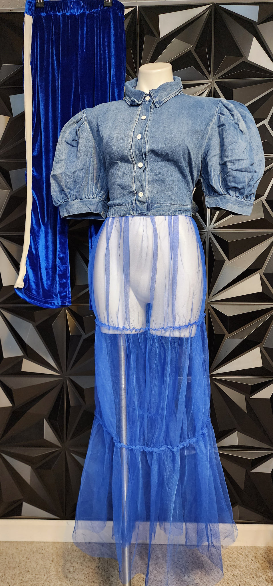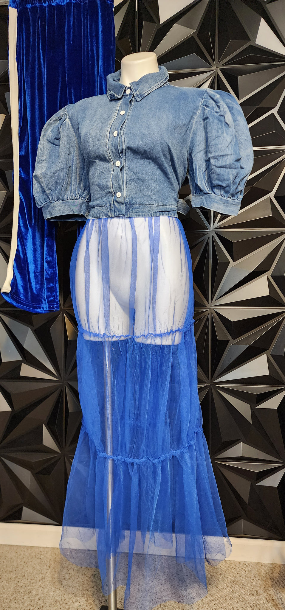 X PLus wear denim and tulle puffer sleeve top. this top pulls over the head and button in the front. It is a size 2xl