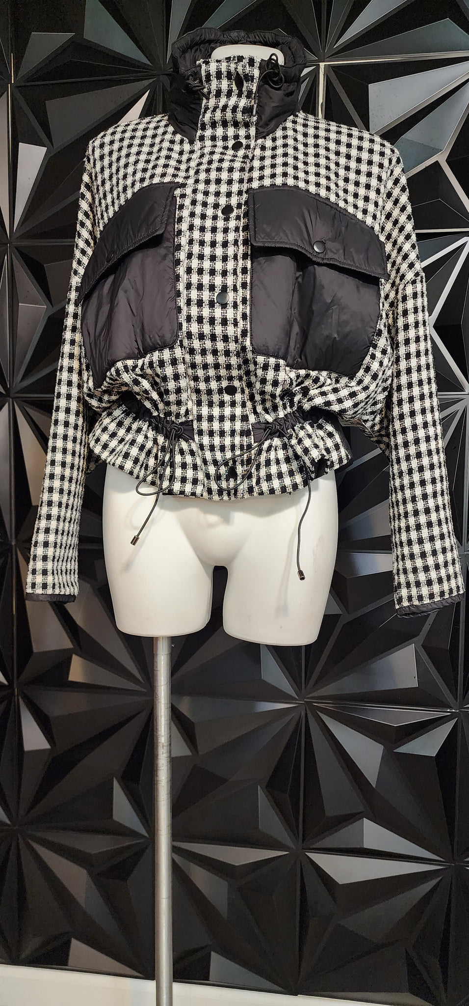 Zara box print jacket. This jacket zips and snaps up the front. drawstring at the waist and at the neck. 2 overisze front pockets. This jacket is tagged a size medium fitting up to a size large (14)